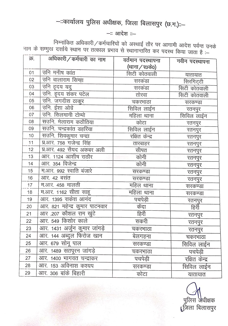 बिलासपुर – पुलिस अधीक्षक संतोष कुमार सिंह ने बुधवार को फिर एक बड़ी संख्या में विभिन्न थानों, चौकी और लाइन में पदस्थ पुलिस कर्मियों का तबादला किया है, जिसमें 7 सब इंस्पेक्टर, 3 एएसआई, 2 हेड कांस्टेबल और 17 कांस्टेबल के नाम शामिल है, जिन्हें जिले के विभिन्न स्थानों में तैनात किया गया है, देखिए लिस्ट