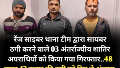 रेंज साइबर थाना टीम द्वारा सायबर ठगी करने वाले 03 अंतर्राज्यीय शातिर अपराधियों को किया गया गिरफ्तार..48 लाख 42 हजार की ठगी को दिए थे अंजाम,