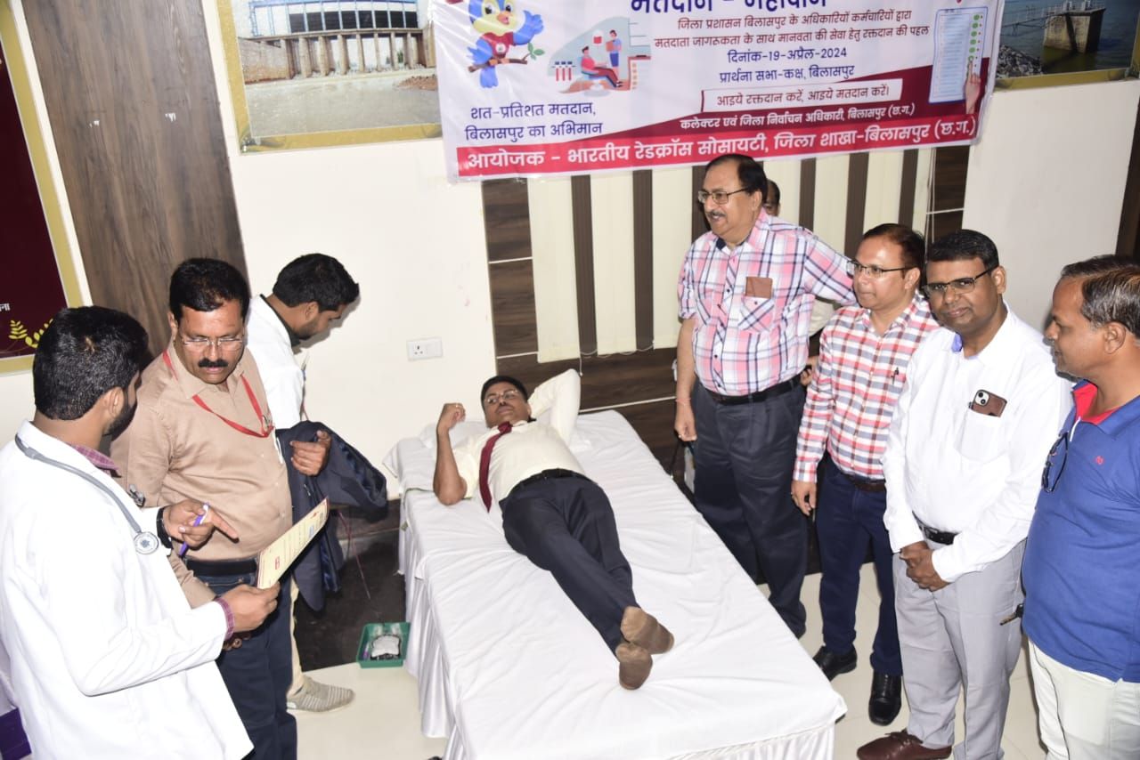 कलेक्टर ने 7 मई को लोकतंत्र के सबसे बड़े उत्सव में इसी प्रकार बढ़-चढ़ कर भाग लेने की अपील की। कलेक्टर ने कहा कि जिले में शत प्रतिशत मतदान का लक्ष्य हासिल कर हमें बिलासपुर का अभिमान बढ़ाना है। लोकतंत्र की मजबूती के लिए हर व्यक्ति को मतदान करना होगा, पांच वर्षाे में एक बार यह अवसर हमें मिलता है। कलेक्टर ने रक्तदान करने वाले युवाओं को प्रशस्ति पत्र देकर सम्मानित किया। इस अवसर पर अटल बिहारी वाजपेयी के कुलपति अरूण दिवाकर नाथ वाजपेयी ने युवाओं को सम्बोधित करते हुए कहा कि मतदान लोकतंत्र को मजबूत बनाने की एक महत्वपूर्ण कड़ी है। सभी अपने मताधिकार का प्रयोग अवश्य करें। इस अवसर पर जिला पंचायत सीईओ व स्वीप के नोडल अधिकारी आर पी चौहान व निगम कमिश्नर अमित कुमार ने भी मतदान का आहवान किया।