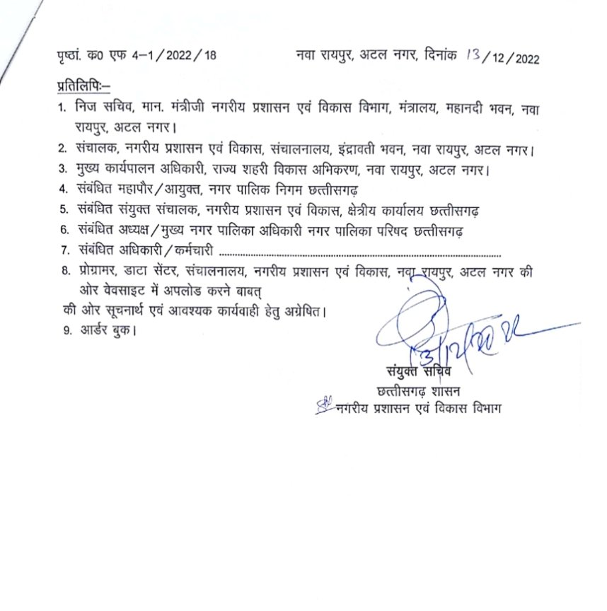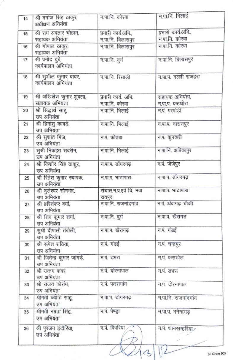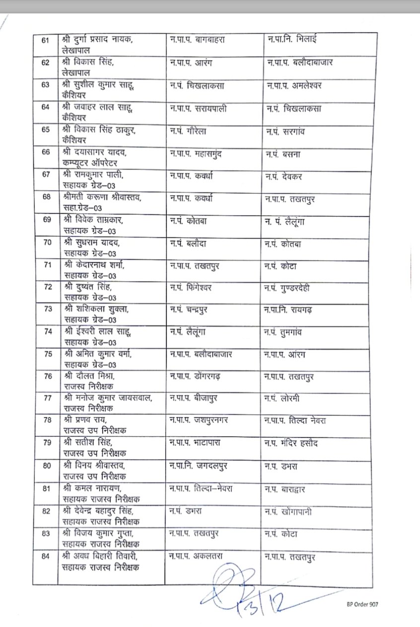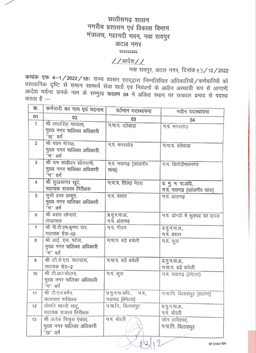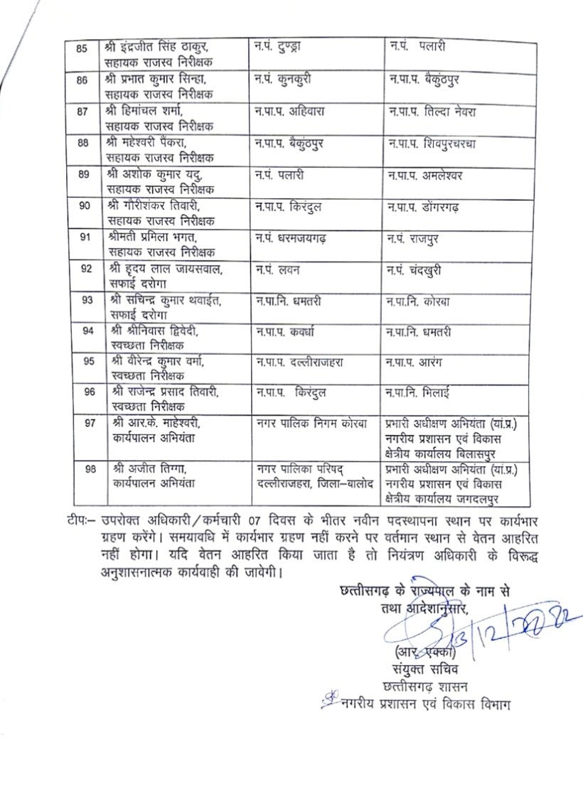 रायपुर – प्रदेश के विभिन्न नगरीय निकायों में पदस्थ 98 कर्मचारियों का तबादला किया गया है, जिसमें मुख्य कार्यपालन अधिकारी से लेकर क्लर्क तक के कर्मचारियों का नाम शामिल है, जिन्हें नगरीय प्रशासन एवं विकास विभाग द्वारा विभिन्न जगहों पर तैनात किया गया है। देखिए आदेश…