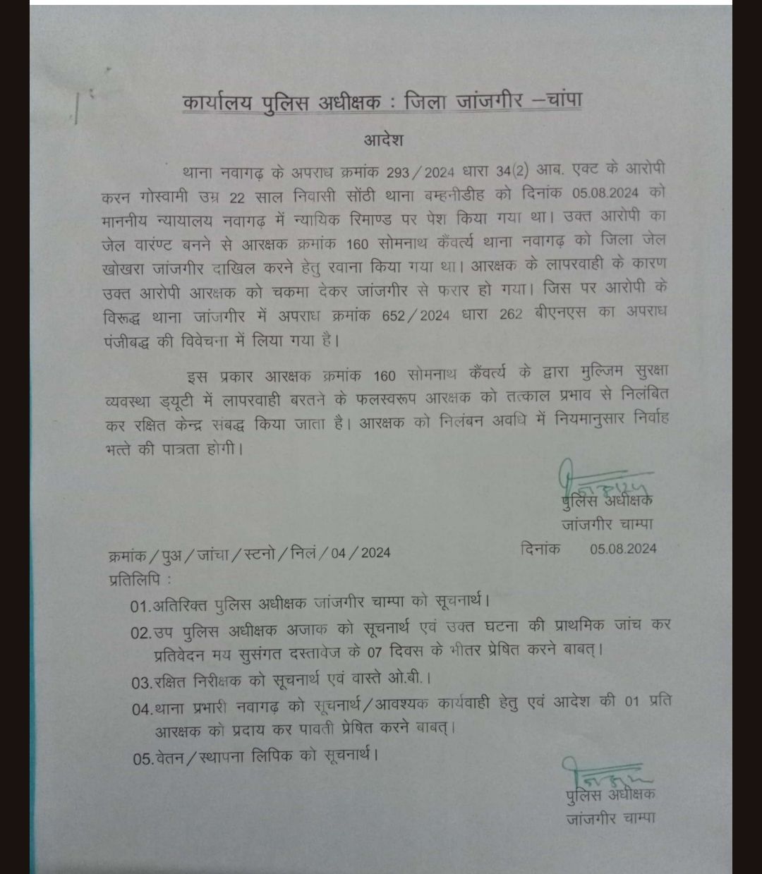 इस प्रकार आरक्षक सोमनाथ कैवर्त्य के द्वारा मुल्जिम सुरक्षा व्यवस्था ड्यूटी में लापरवाही बरतने से आरक्षक को विवेक शुक्ला पुलिस अधीक्षक जांजगीर चांपा द्वारा तत्काल प्रभाव से निलंबन कर रक्षित केंद्र जांजगीर संबद्ध किया गया है।