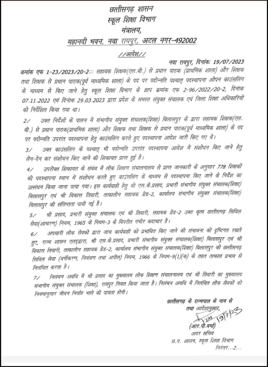 रायपुर – सहायक शिक्षक से प्रधान पाठक और शिक्षक तथा शिक्षक प्रधान पाठक के पद पर पदोन्नति के बाद पदस्थापना के खुली काउंसिल के माध्यम करने के निर्देश समस्त संयुक्त संचालकों और डीईओ को जारी किए गए थे, जिसके तहत बिलासपुर संभाग में भी खुली काउंसिल के तहत प्रक्रिया पूर्ण की गई, लेकिन इसके बाद पदस्थापना में संशोधन के नाम पर गड़बड़ी की शिकायत सामने आने पर अब स्कूल शिक्षा विभाग ने बिलासपुर के संयुक्त संचालक एस के प्रसाद और तत्कालीन सहायक ग्रेड 2 विकास तिवारी को निलंबित कर दिया गया है। जिन्हें निलंबन अवधि में मुख्यालय अटैच किया गया है देखिए आदेश..