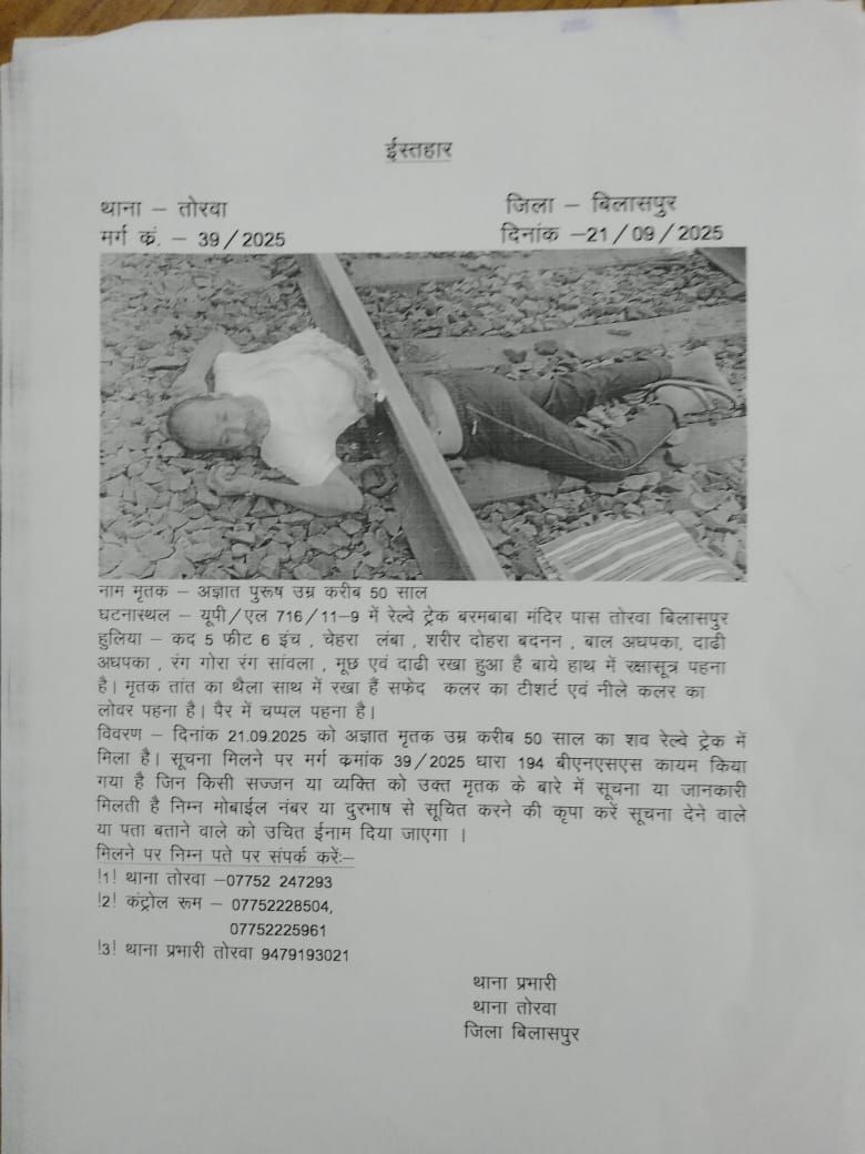 बिलासपुर – तोरवा थाना क्षेत्र के बरम बाबा मंदिर के पास रविवार शाम लगभग 4 बजे के आसपास रेलवे ट्रैक पर एक अज्ञात व्यक्ति की लाश मिलने से सनसनी फैल गई। मृतक की उम्र लगभग 50 वर्ष बताई जा रही है। प्रत्यक्षदर्शियों के अनुसार, शव दो हिस्सों में कटा हुआ रेलवे ट्रैक पर पड़ा हुआ था। स्थानीय लोगों ने घटना की सूचना तत्काल तोरवा पुलिस को दी।
