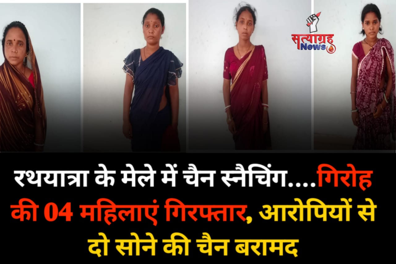 रायगढ़ – थाना घरघोड़ा क्षेत्र अंतर्गत इन दिनों गांव में रथ मेले का आयोजन किया जा रहा है । रथ मेले की भीड़ में पॉकेटमारी, चैन स्नेचिंग को अंजाम देने वाले गिरोह की 04 महिलाओं को रंगे हाथ ग्रामीणों ने पकड़ा । घरघोड़ा पुलिस ने महिला आरोपियों से 02 सोने की चैन बरामद किया है, आरोपियों से पूछताछ में इनके गिरोह में दो पुरुष सदस्यों के भी शामिल होने की जानकारी मिली है जिनकी गिरफ्तारी के लिये घरघोड़ा पुलिस द्वारा छापेमारी की जा रही है । ग़ौरतलब है कि 10.07.2024 को थाना घरघोड़ा में वीना राठिया (25 साल) निवासी ग्राम कोगनारा द्वारा ग्राम कोगनारा के रथ मेला में इसके तथा गांव की कलेन्द्री राठिया के गले से पहने एक-एक नग सोने की माला को आरोपी आरती गिरी, राधा बाई, हेमाबाई गिरी, तिरथनी बाई द्वारा लूटपाट किये जाने की रिपोर्ट दर्ज करायी गई।