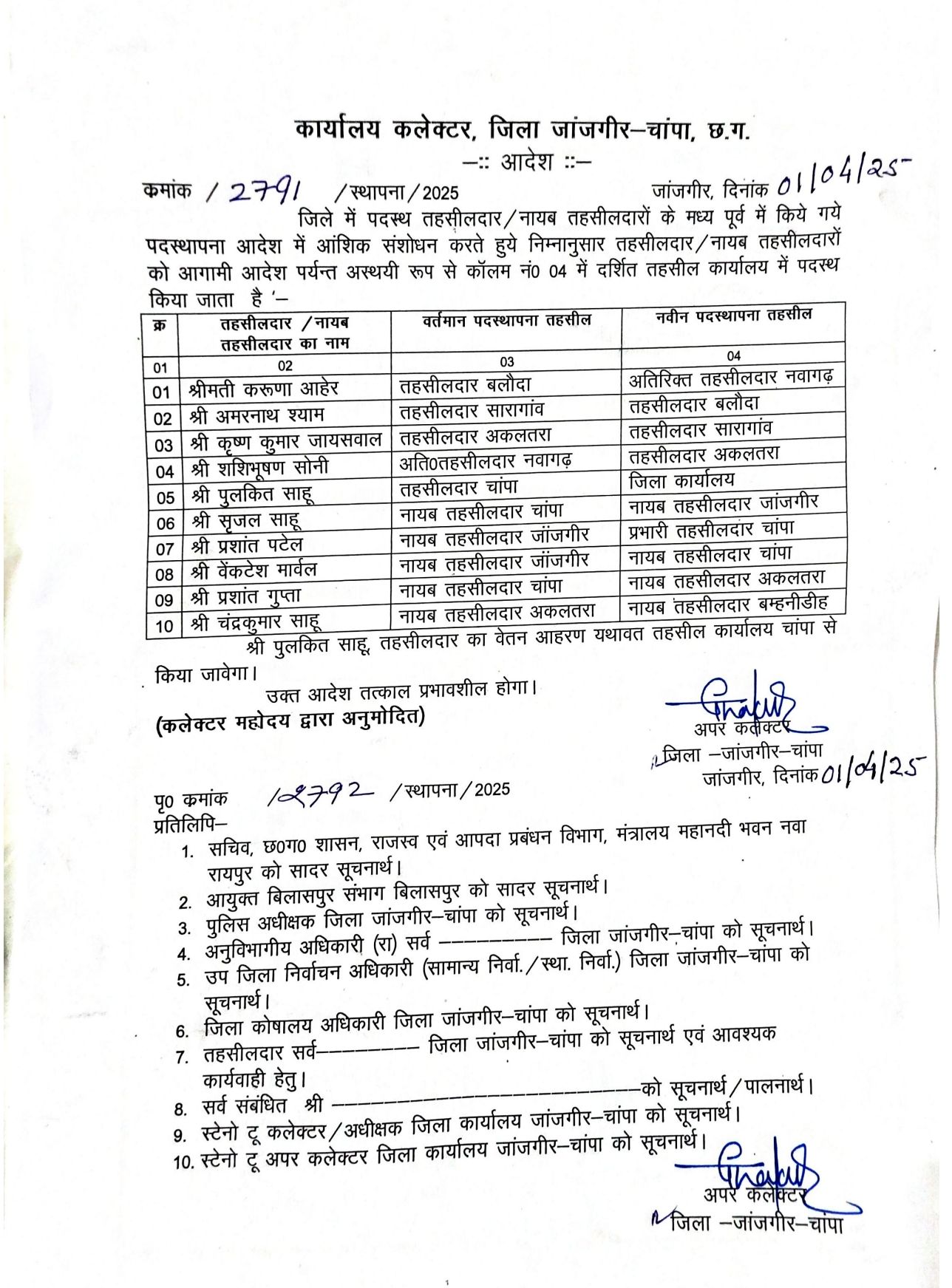 जिले में तहसीलदारों के प्रभार में बदलाव…स्थानांतरण आदेश जारी,