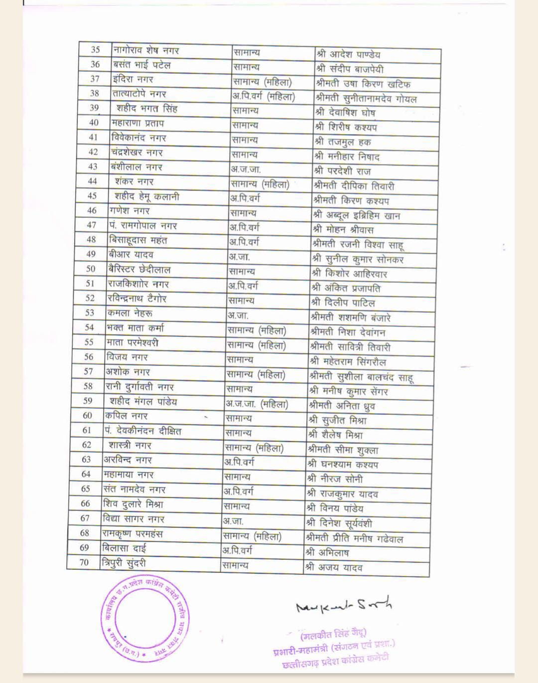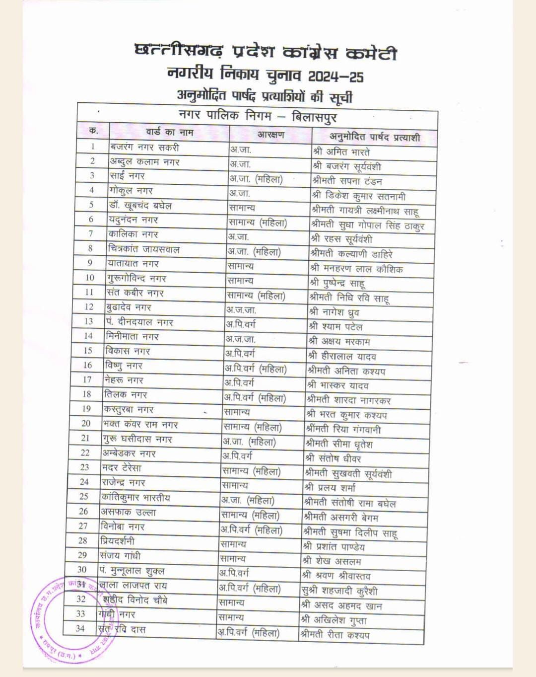 बिलासपुर – सोमवार शाम को आखिरकार प्रदेश कांग्रेस की ओर से बिलासपुर नगर निगम के पार्षद प्रत्याशियों की पूरी लिस्ट जारी कर दी गई है, जिनमें कई पुराने तो कई नए चहरो को मौका दिया गया है….देखिए लिस्ट