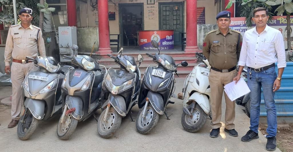 नाबालिग के विरूद्ध परिजनो की उपस्थित में कार्यवाही की गई। इसी क्रम में आज मुखबिर की सूचना पर थाना सिटी कोतवाली पुलिस द्वारा मधुबन रोड दयालबंद में चोरी के एविटर वाहन बेचने हेतु ग्राहक तलाश करते एक अन्य नाबालिग को पकडा गया। जिससे उक्त बिना नंबर जुपिटर वाहन, इंजन नंबर BK4GN1405326 के संबंध में पूछताछ करने पर उक्त एपिटर वाहन को तोरवा क्षेत्र से चोरी करना स्वीकार किया। जिसकी निशान देही में उसके घर से एक अन्य जुपिटर वाहन, इंजन नंबर JF21E9150941 को जप्त किया गया। जप्त स्कुटी वाहनो के स्वामी की पता तलाश की जा रही है। विशेषयोगदानः-निरीक्षक कमला पुसाम ठाकुर, उनि बसंत कुमार साहू प्र.आर. निर्मल सिंह, फुलसिंह बड्डे, आर. गोकुल जांगडे, नुरूल कादिर, प्रेम सूर्यवंशी।