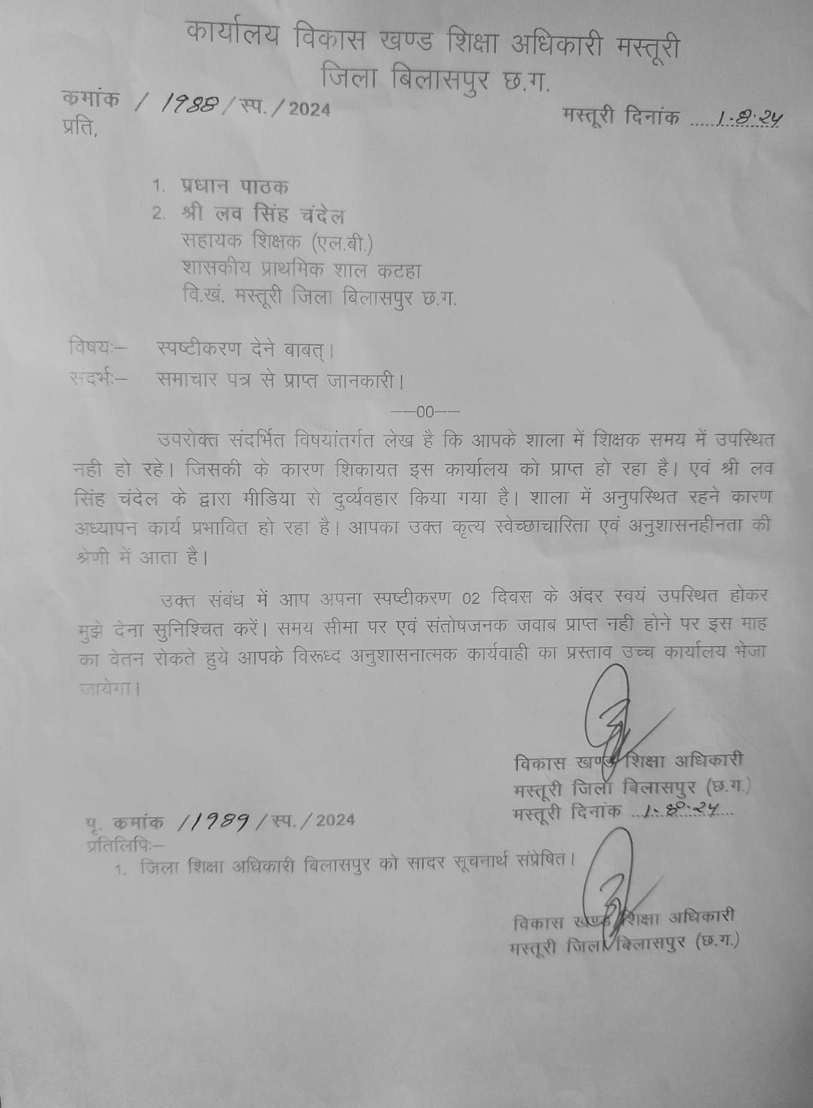 मिली जानकारी के अनुसार शासकीय प्राथमिक शाला में पदस्थ सहायक शिक्षक लव सिंह चंदेल तो सारी हदें पार कर दी और उन्होंने मीडिया कर्मी से अधिकारी से परमिशन लेकर अंदर आने की बात कहने लगे, जबकि इस स्थिति यानी कि स्कूल में शिक्षकों की मनमानी की शिकायत बच्चों के पालको ने ही कि थी जो मौके पर मौजूद भी थी। मामले में ग्रामीणों और मीडियाकर्मी की शिकायत के बाद खंड शिक्षा अधिकारी ने संबंधित प्रधानपाठक और सहायक शिक्षक को नोटिस जारी किया है और 2 दिवस के भीतर स्पष्टीकरण प्रस्तुत करने आदेश दिए है। अब देखना होगा कि सरकारी स्कूलों में चल रही शिक्षकों की मनमानी और मासूम बच्चों के भविष्य के साथ खिलवाड़ करने वालो पर आखिर कब तक कार्रवाई होती है।