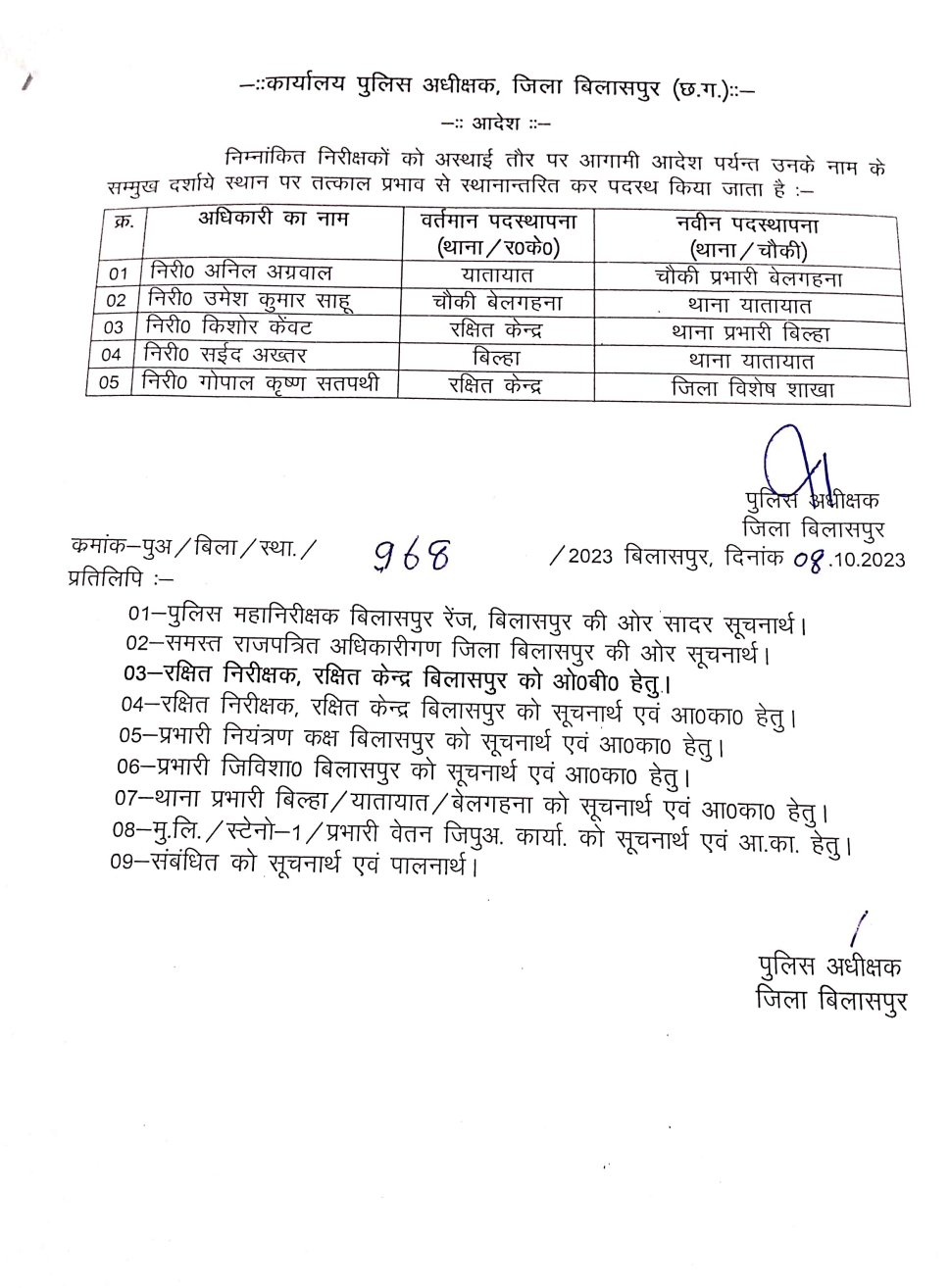 बिलासपुर – पुलिस अधीक्षक ने जिले के 5 निरीक्षकों की तैनाती में फिर बदलाव करते हुए नई पदस्थापना लिस्ट जारी की है, जिसमें यातायात, बिल्हा और बेलगहना में प्रभारी प्रभावित हुए है।