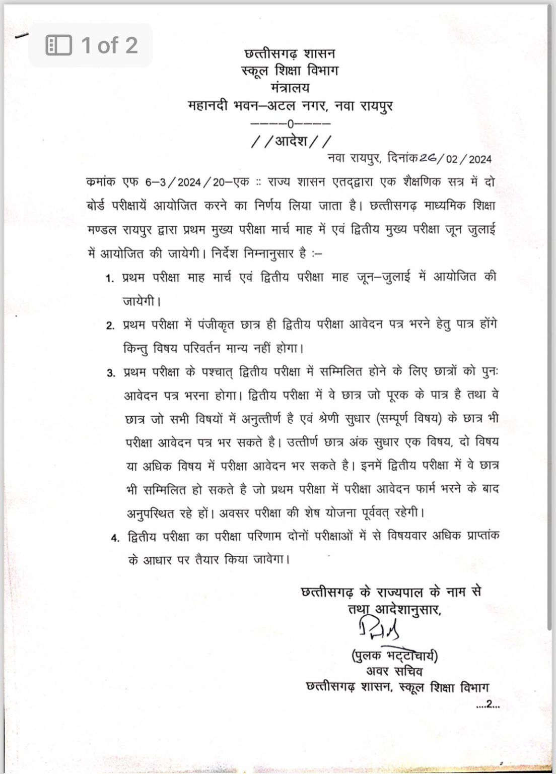 शैक्षणिक सत्र में 2 बोर्ड परीक्षाओं का होगा आयोजन….राज्य शासन ने जारी किए आदेश