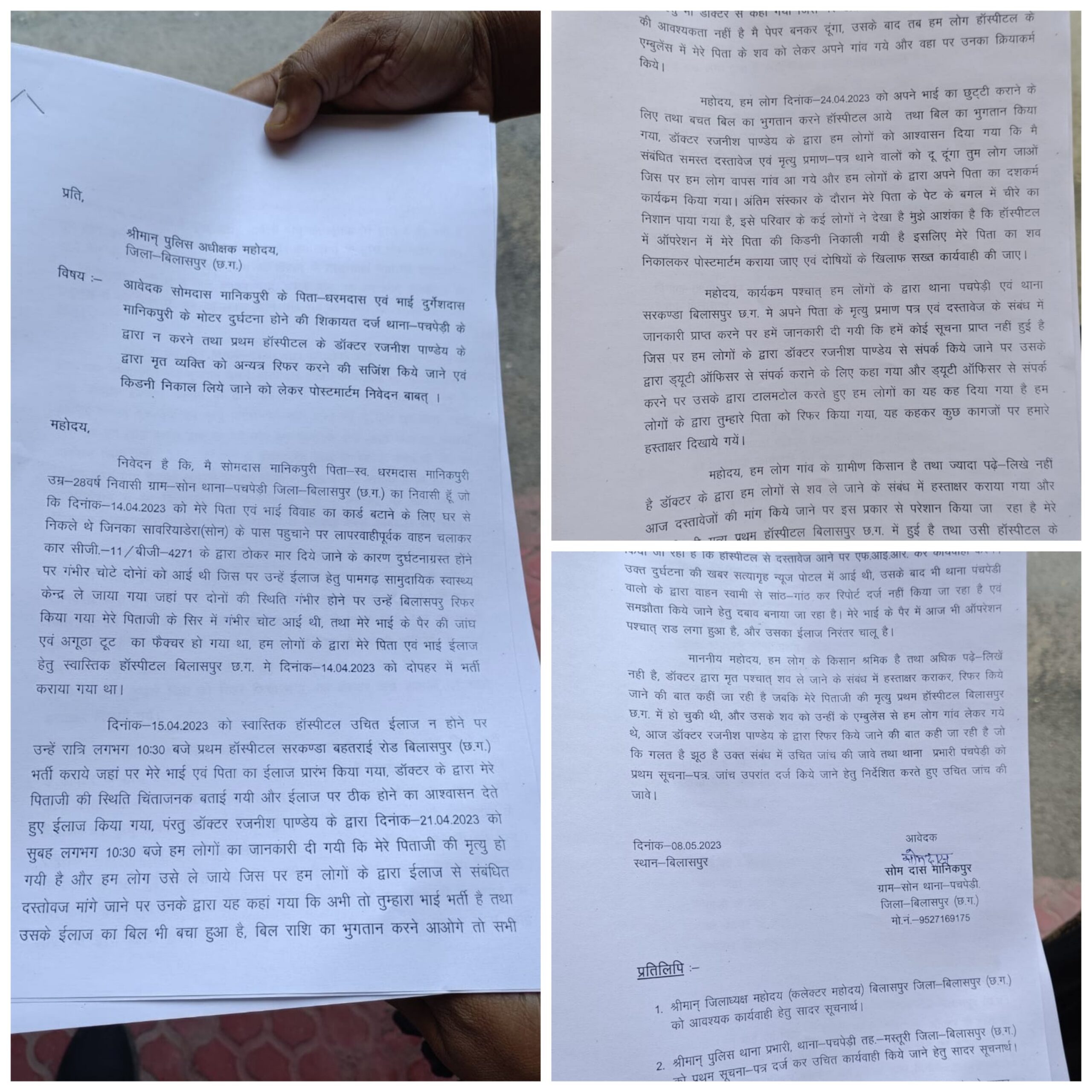 शिकायत में सोन लोहर्सी निवासी सोमदास मानिकपुरी ने बताया है कि उसके पिता का एक्सीडेंट होने पर उन्हे प्रथम हॉस्पिटल में भर्ती कराया गया, जहां उनका ऑपरेशन किया गया और दुसरे ही दिन लंबा बिल वसूलकर पिता का मृत शरीर दे दिया गया। आरोप है की अंतिम संस्कार के अंतिम स्नान के वक्त परिजनों ने पिता के पेट के बगल में चार इंच का चीरा लगा होना पाया। जिससे आशंका है की मृतक के शरीर से किडनी निकाला गया है। ग़ौरतलब है कि 14 अप्रैल को सोमदास के पिता और भाई उसके शादी का कार्ड बांटने निकले थें, सावरिया डेरा (सोन) के पास दूसरी तरफ से आ रही तेज रफ्तार स्कार्पियो CG 11 BG 4271 ने पिता पुत्र की गाड़ी को ठोकर मार दिया। जिससे पिता धरम दास के सर पर गंभीर चोट आई और भाई का पैर टूट गया।