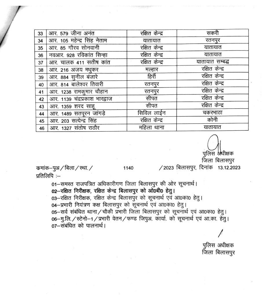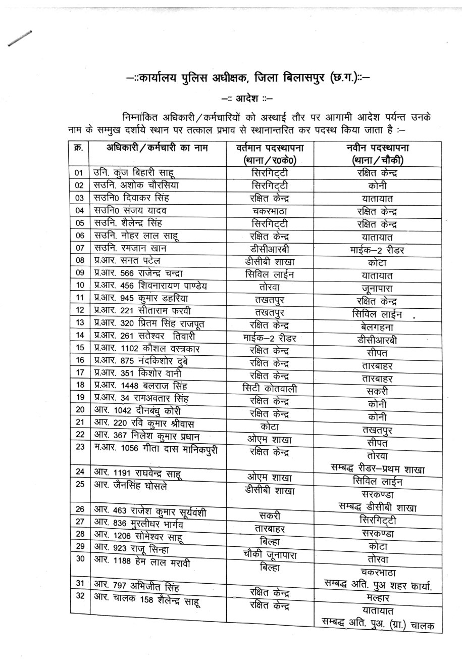 बिलासपुर – जिले में पुलिस अधीक्षक ने बड़ी संख्या में पुलिस कर्मचारियों का तबादला आदेश जारी किया है, जिनमे निरीक्षक से लेकर आरक्षक तक के कर्मचारियों के नाम शामिल है। इस आदेश में कई थाना प्रभारियों को भी इधर से उधर किया गया है देखिए लिस्ट…