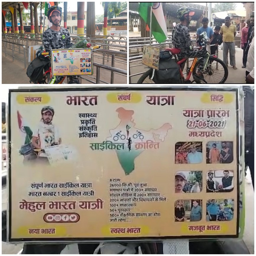 रतनपुर – देश की संस्कृति, प्रकृति, स्वास्थ्य और इतिहास को जानने और लोगों को जागरूक करने की मंशा से मध्यप्रदेश से एक युवक पूरे भारत की यात्रा सायकल से करने निकला है, जिसनें 21 जून 2021 को अपनी यात्रा की शुरुआत की और अब तक 8 राज्यों की लगभग 28 हजार किलोमीटर की यात्रा पूरी कर अब छत्तीसगढ़ पहुँचा है,