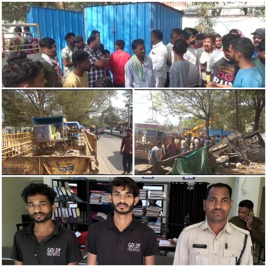 जो कॉलेज आने जाने के दौरान उनके साथ छेड़खानी कर उन्हें परेशान करते हैं। इस मामले को गंभीरता से लेते हुए कलेक्टर ने नगर निगम को निर्देशित किया कि वह यहां नियम विरुद्ध बने अवैध ठिकानों को हटाए। जिस पर कार्यवाही करने मंगलवार को नगर निगम अतिक्रमण शाखा का दस्ता पहुंचा था। यहां आस-पास कुछ गुमटी नुमा दुकान मौजूद है, जिनके संचालको समझाइश देते हुए उन्हें हटाने का अभियान चल रहा था, इसी में गोल्डी टी स्टॉल भी शामिल है। जिसके संचालक चिंगराजपारा निवासी भावेश गुप्ता और गोल्डी गुप्ता है।