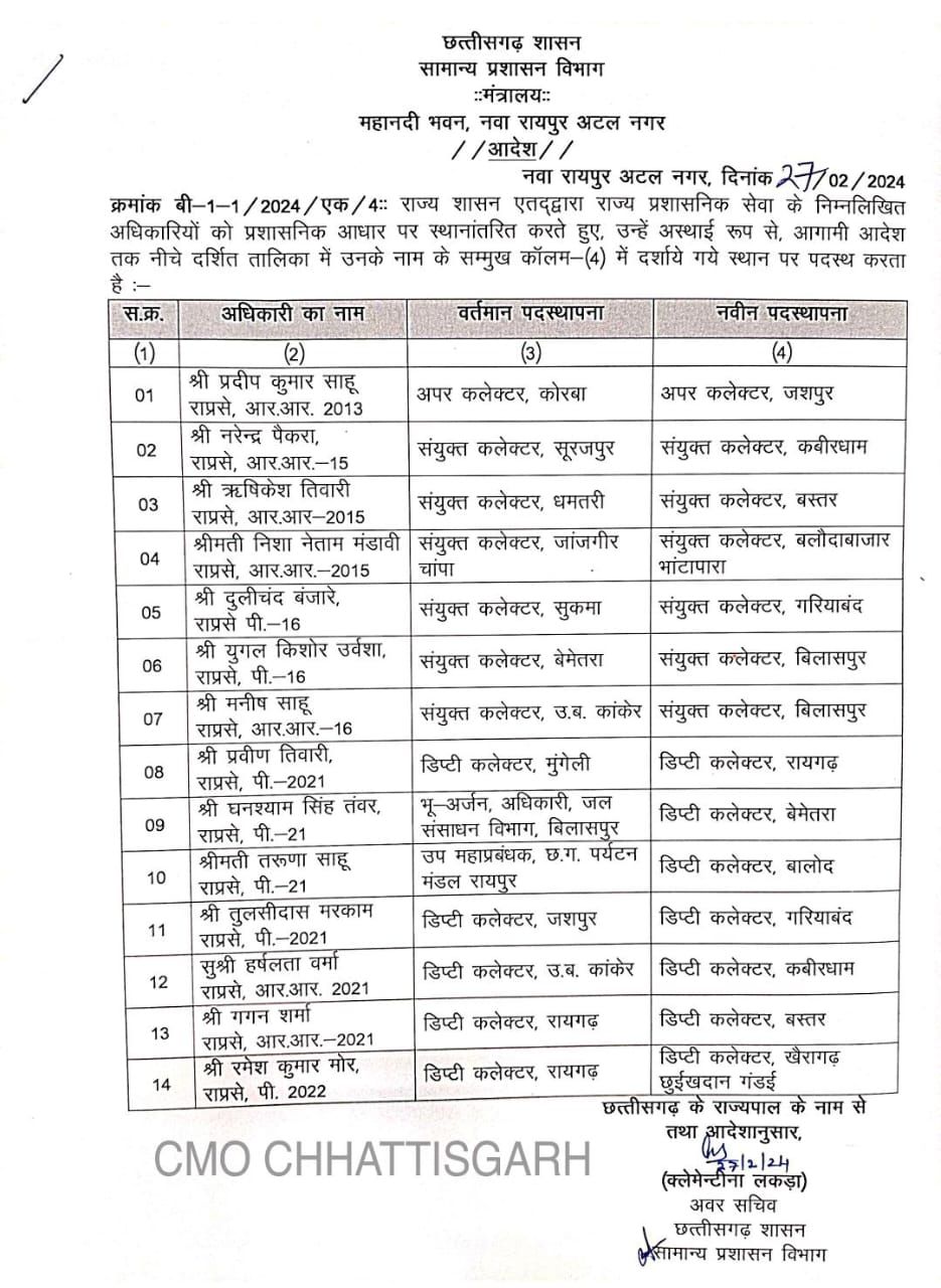 रायपुर – निर्वाचन आयोग के निर्देश अनुसार एक बार फिर राज्य प्रशासनिक सेवा के अधिकारियों का तबादला आदेश जारी किया गया है, जिसमें कई जिलों के डिप्टी कलेक्टर इधर से उधर किये गए है…देखिए लिस्ट