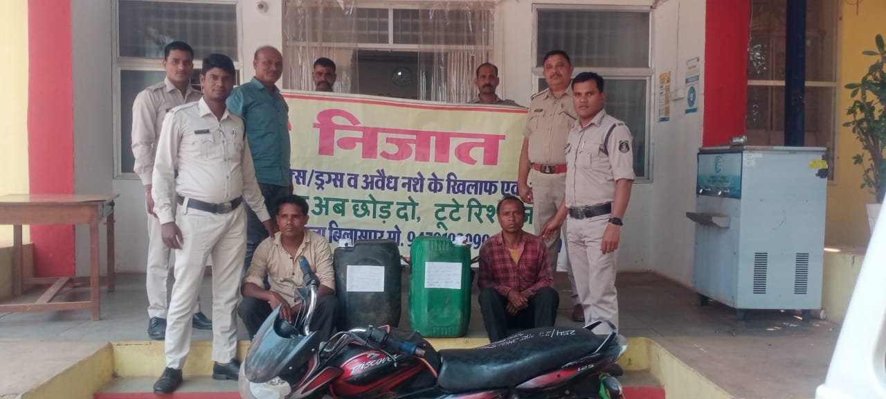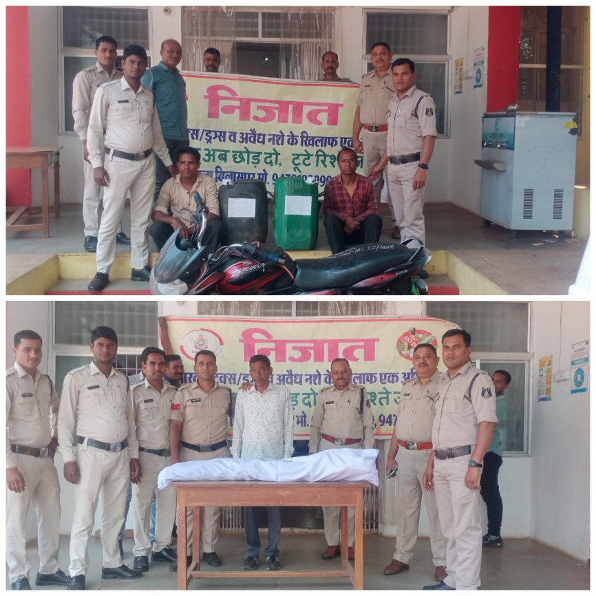 सीपत पुलिस ने ग्राम धौराकोना छापेमारी कार्यवाही कर आरोपी रमेश कुमार यादव पिता समारू यादव उम्र 32 वर्ष निवासी पनोरापारा थाना बलौदा जिला जांजगीर चांपा के कब्जे से एक काला रंग की 35 लीटर क्षमता वाली जेरीकेन मे भरा करीबन 35 लीटर कच्ची महुआ शराब कीमती 3500 रूपये व एक मोटर सायकल काला रंग का जिसका रजिस्टेशन क्रमांक सीजी 11एफ 7365 कीमती 15000 रूपये जुमला कीमती 18500 रूपये तथा आरोपी – लतेलू राम केवट पिता स्व. दयाराम उम्र 47 वर्ष निवासी पनोरापारा थाना बलौदा जिला जांजगीर चांपा(छ. ग.) के कब्जे से एक हरा रंग की 35 लीटर क्षमता वाली प्लास्टिक जरिकेन में करीबन 32 लीटर कच्ची महुआ शराब भरा हुआ,