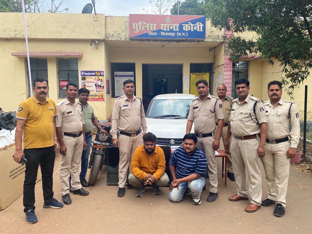बिलासपुर – पर्सनल लोन दिलाने का झांसा देकर 7.65 लाख की ठगी करने वाले दो आरोपी को कोनी पुलिस ने गिरफ़्तार कर लिया है। मिली जानकारी के अनुसार प्रार्थी ग्राम परसदा निवासी हरिराम मरकाम और तरूणा इंगोले को पर्सनल लोन दिलाने की बात कहते हुए आरोपी गीतांजली पार्क निवासी रवि कुमार नायर उर्फ जय और बिरकोना निवासी अल्केश सोनी उर्फ छोटू ने पर्सनल लोन दिलवाने के नाम से इससे पेन कार्ड, आधार कार्ड, मोबाईल सीम, बैक पासबुक एवं पासपोर्ट फोटो ले लिया। और उनके नाम से क्रैडिट कार्ड निकलवाकर दोनो ही प्रार्थी के नए क्रैडिट कार्ड से 7 लाख 65 हज़ार रुपए स्वाइब कर पैसे को हजम कर लिया। जिसकी शिकायत कोनी थाने में रिपोर्ट दर्ज कराई गई थी। जिसको लेकर कोनी कोनी और ए.सी.सी.यू. स्टाफ के संयुक्त टीम द्वारा आरोपियों की खोज बीज शुरू की। इस दौरान उनके ठिकानों पर दबिश देकर दोनो आरोपियों को पुलिस ने गिरफ़्तार कर लिया। जिनके कब्जे से पुलिस ने एक नग स्वीफ्ट डिजायर कार, बुलेट मोटर सायकल सहित चार नग मोबाईल जप्त किया है। वही दोनो आरोपियों को न्यायिक हिरासत में भेज दिया है।