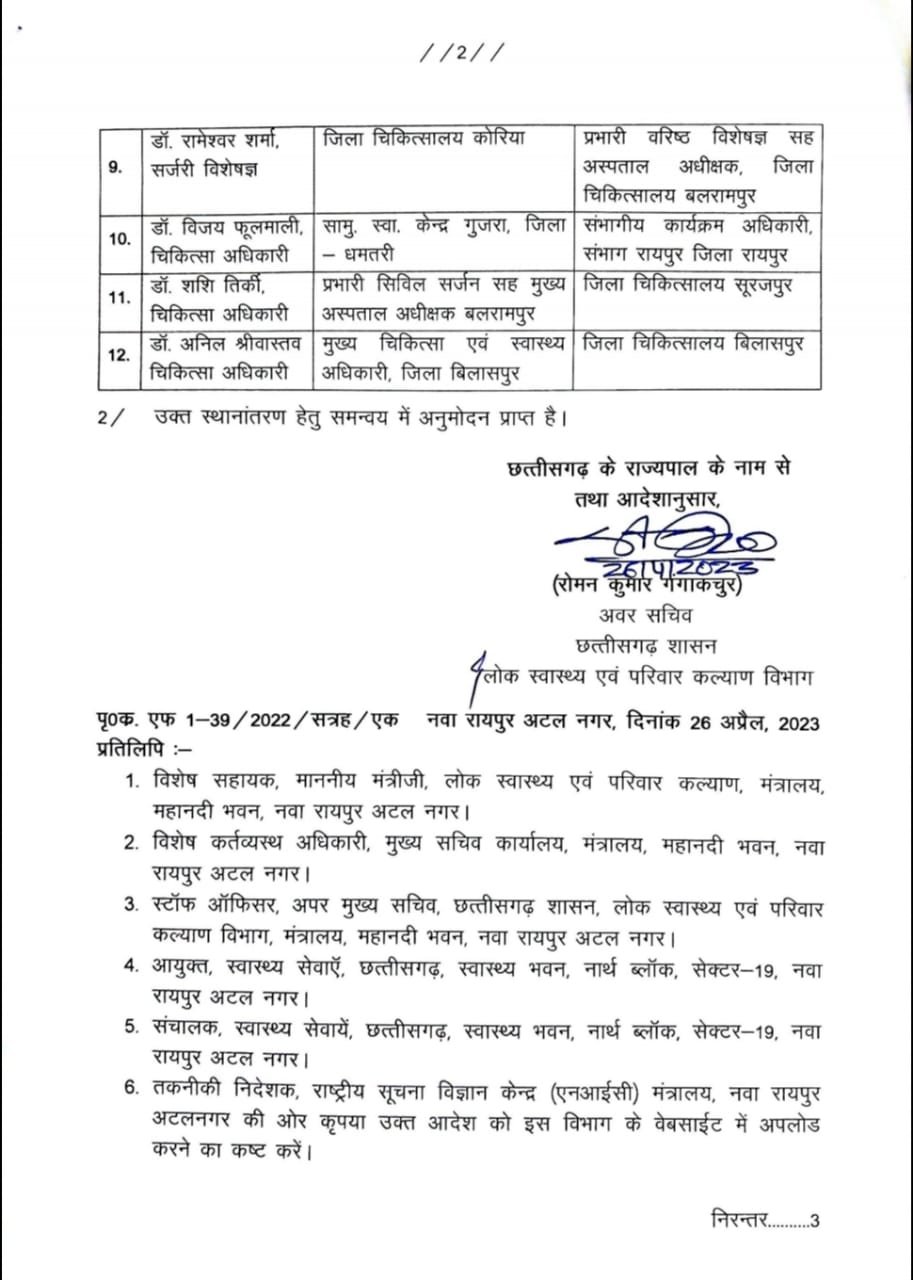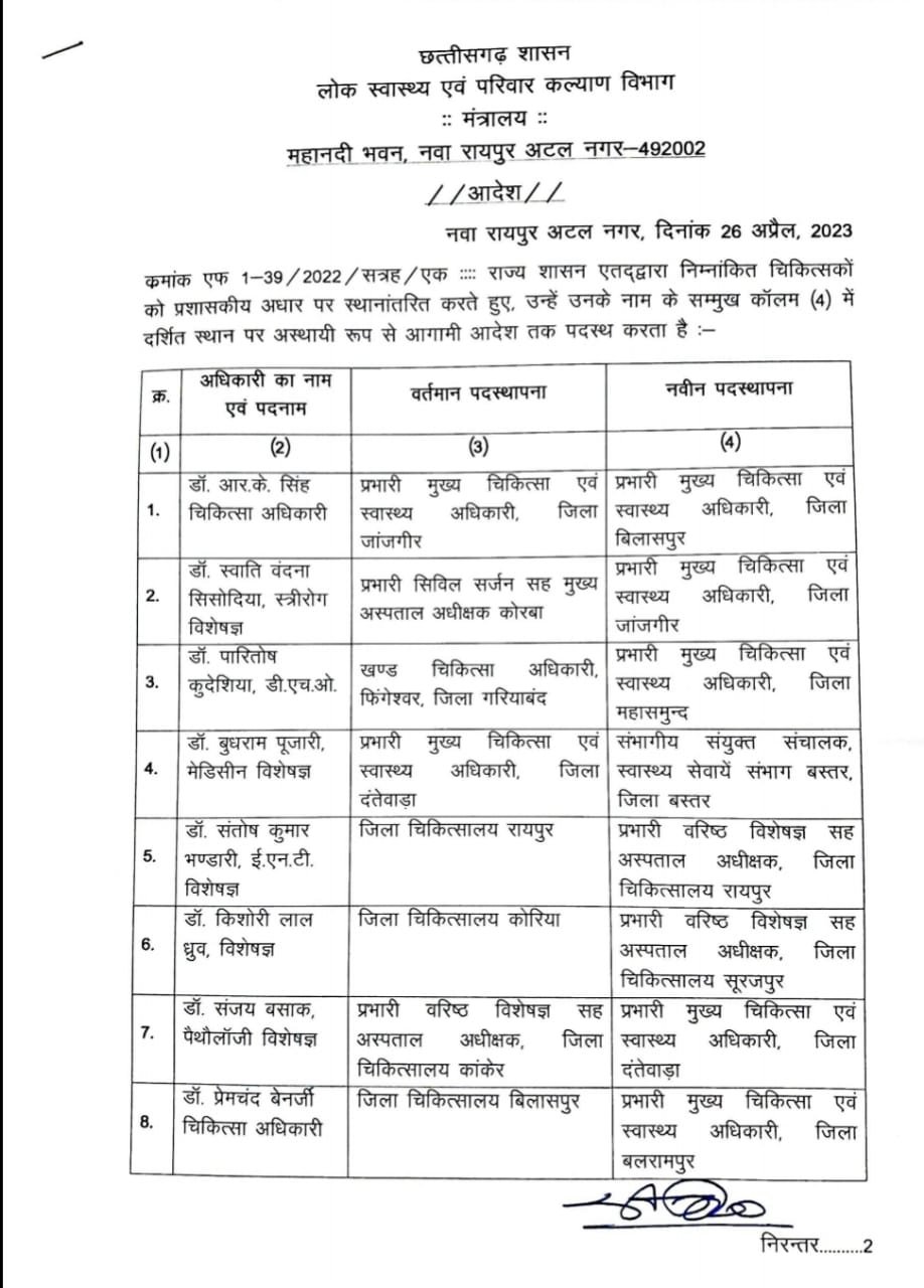 रायपुर- प्रदेश में एकबार फिर स्वास्थ्य महकमें में तबादले का दौर शुरू हों गया है। जहाँ प्रदेशभर से एक दर्जन अधिकारियो का ट्रान्सफर लिस्ट जारी किया गया है। जिसमे बिलासपुर सहित पांच जिले के मुख्य चिकित्सा एवं स्वास्थ्य अधिकारियो को ट्रान्सफर किया गया है। साथ ही हॉस्पिटल सहायक अधीक्षक के साथ संभागीय संयुक्त संचालक की जिम्मेदारी सौंपी गई है। इसमें प्रमुख रूप से सुर्खियों में रहने वाले बिलासपुर सीएमएचओ पद की जिम्मेदारी डॉ आर के सिंह को दी गई है। वही बिलासपुर सीएमएचओ डॉ अनिल श्रीवास्तव को जिला अस्पताल में पदस्थ किया गया है। वही सूत्रों की माने तो डॉ आर के सिंह के रिटायरमेंट में महज कुछ ही महीने बचे है। ऐसे में उनके द्वारा ज्वाइनिंग को लेकर कई तरह की अटकलें लगाई जा रही है। देखिए लिस्ट