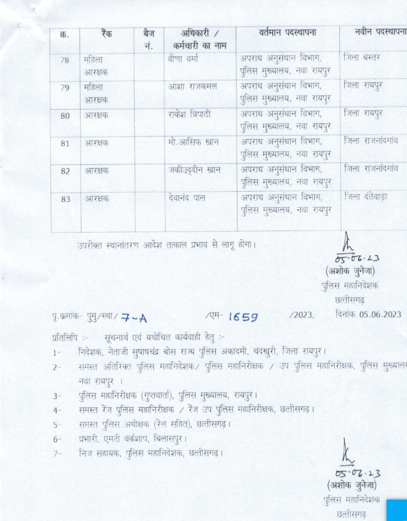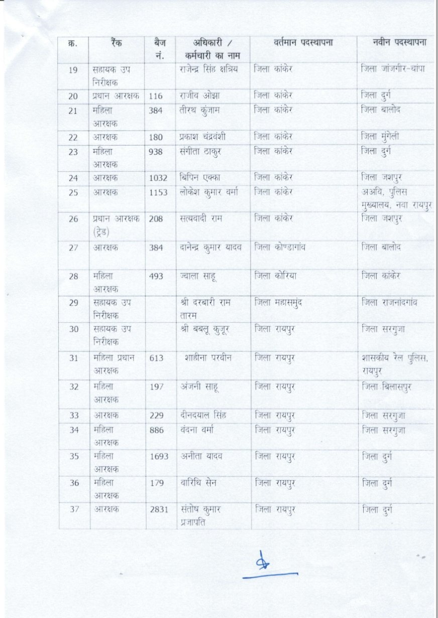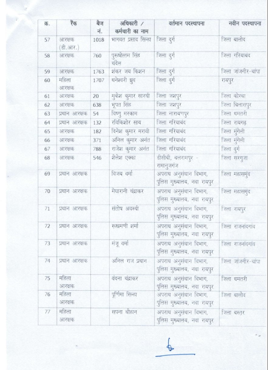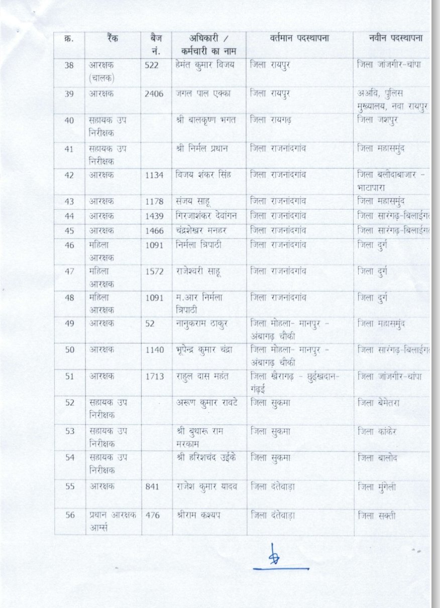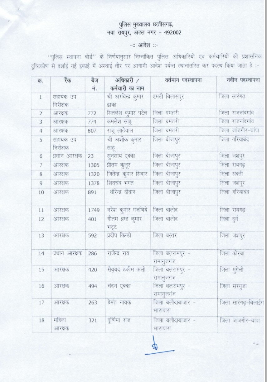 रायपुर – प्रदेश के विभिन्न जिलों में तैनात रक्षित निरीक्षकों से लेकर उप निरीक्षकों, सहायक उप निरीक्षकों प्रधान आरक्षक सहित आरक्षकों का तबादला आदेश जारी किया गया है, लंबे समय से इस लिस्ट के निकलने की प्रतीक्षा की जा रही थी, वही अब सभी की नई तैनाती की गई है, देखिए लिस्ट