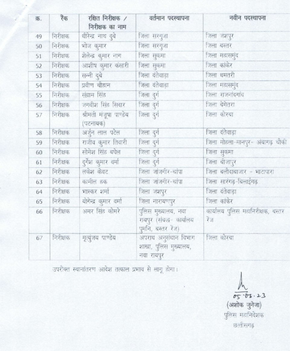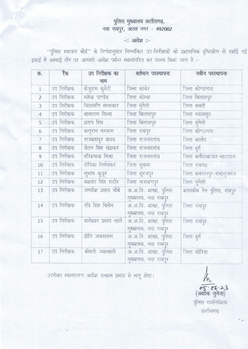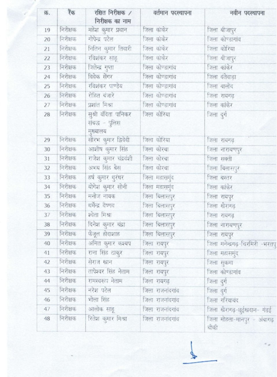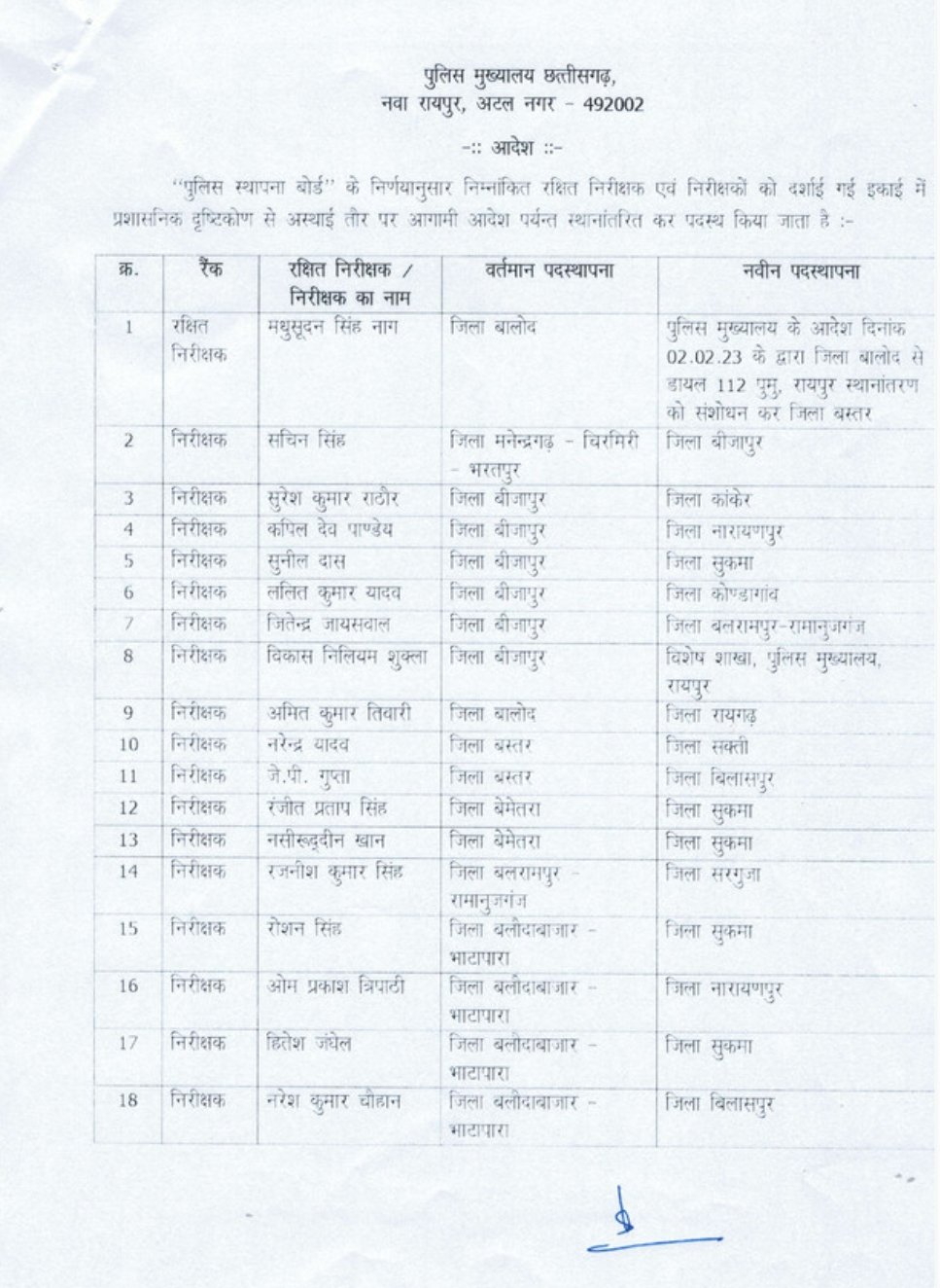 रायपुर – प्रदेश के विभिन्न जिलों में तैनात रक्षित निरीक्षकों से लेकर उप निरीक्षकों, सहायक उप निरीक्षकों प्रधान आरक्षक सहित आरक्षकों का तबादला आदेश जारी किया गया है, लंबे समय से इस लिस्ट के निकलने की प्रतीक्षा की जा रही थी, वही अब सभी की नई तैनाती की गई है, देखिए लिस्ट