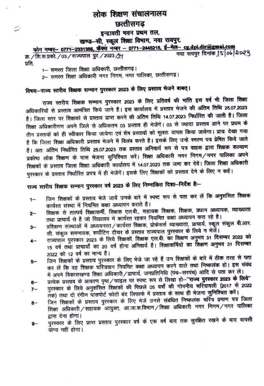 रायपुर – राज्य स्तरीय शिक्षक सम्मान पुरस्कार 2023 को लेकर डीपीआई ने प्रदेश के सभी जिला शिक्षा अधिकारियों से प्रस्ताव भेजने के निर्देश दिया है। मालूम हो की राज्य स्तरीय शिक्षक सम्मान पुरस्कार 2023 के लिए प्रतिवर्ष की भांति इस वर्ष भी जिला शिक्षा अधिकारियों से प्रस्ताव आमंत्रित किए जाने है। डीपीआई में प्रस्ताव भेजने की अंतिम तिथि 25 जुलाई 2023 तक है। वही जिला स्तर पर शिक्षको से प्रस्ताव प्राप्त करने की अंतिम तिथि 14