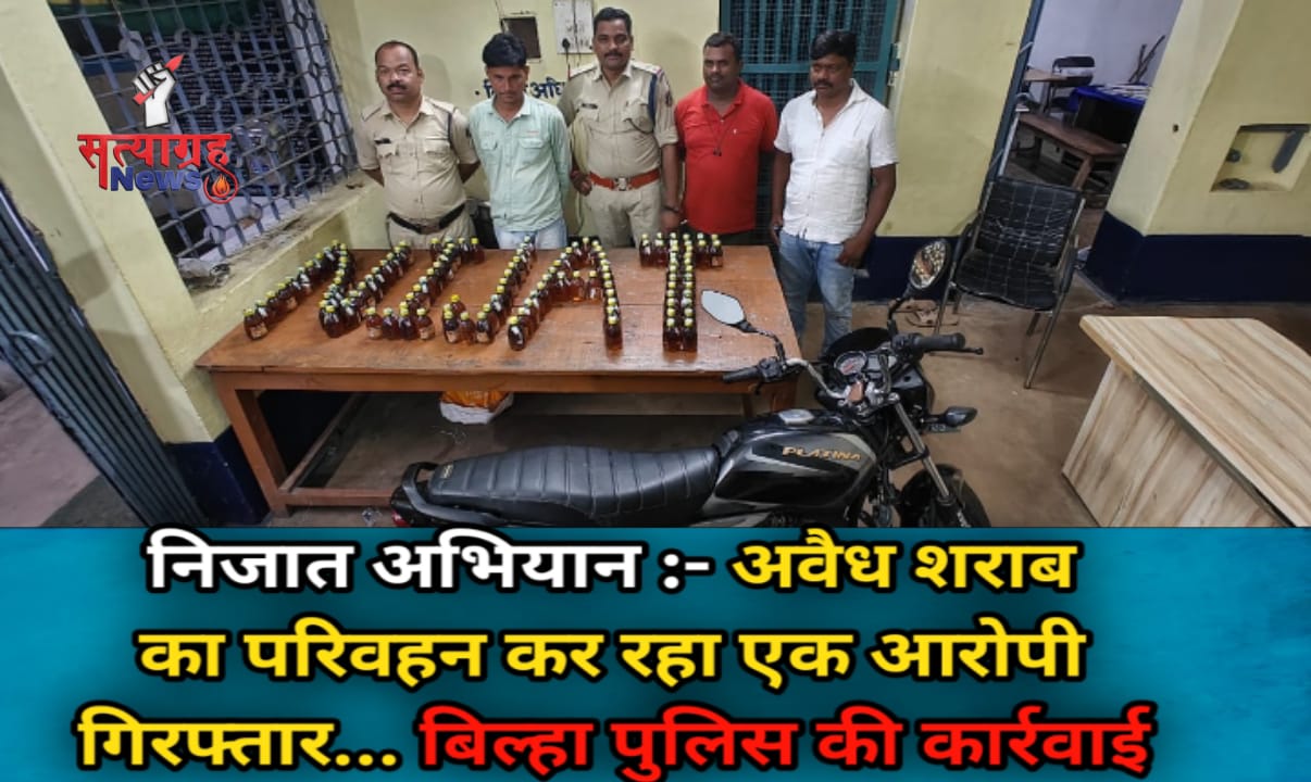 जिसे जब्त कर बिल्हा पुलिस ने आरोपी को गिरफ़्तार कर लिया है। वही आरोपी के खिलाफ आबकारी एक्ट के तहत कार्यवाही की गई है। इस कार्यवाही में उप निरीक्षक रविंद्र कुमार यादव थाना प्रभारी,प्रधान आर अनिल साहू, आर रंजीत खलखो, संतोष मरकाम, सचिन नामदेव,मनीष सिंह का अहम योगदान रहा।