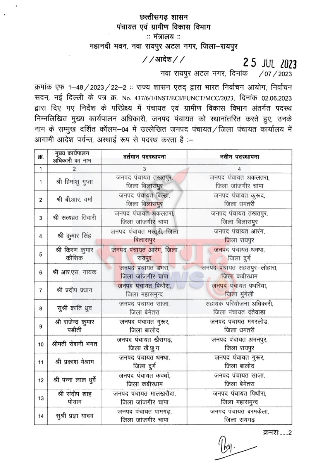 रमेश राजपूत रायपुर - राज्य शासन ने किए 14 जनपद सीईओ के तबादले,भारत निर्वाचन आयोग के परिपेक्ष में यह तबादले हुए है,देखिए आदेश