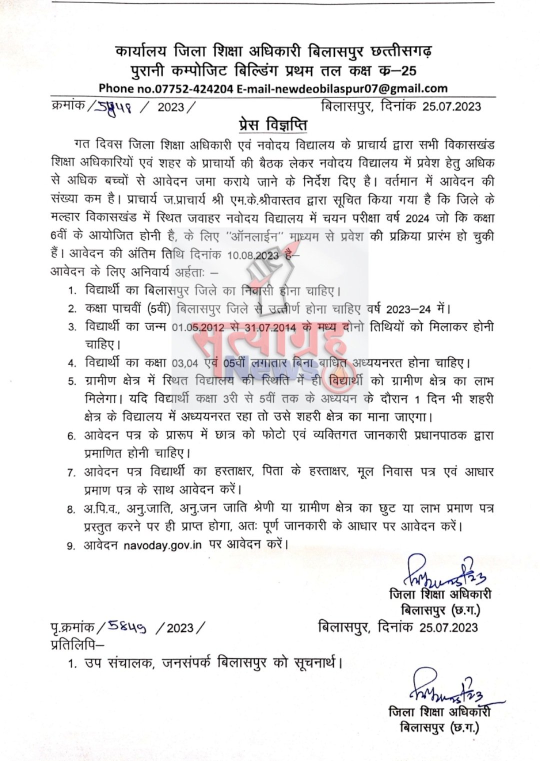 मल्हार – नवोदय विद्यालय में कक्षा 6 वीं में प्रवेश के लिए लिखित परीक्षा 20 जनवरी 2024 को आयोजित की जाएगी। सत्र 2024-25 में कक्षा छह में प्रवेश के लिए ऑनलाइन आवेदन करने की अंतिम तिथि 10 अगस्त है। इस मामले में मल्हार स्थित नवोदय विद्यालय के प्राचार्य एम के श्रीवास्तव ने बताया कि जो विद्यार्थी सत्र 2023-24 में कक्षा पांचवीं में अध्ययनरत हैं, वे ऑनलाइन आवेदन कर सकते हैं। इस बार कक्षा छह में प्रवेश के लिए लिखित परीक्षा आयोजित की जाएगी। जिन विद्यार्थियों ने ऑनलाइन आवेदन पत्र भरे हैं, उनकी परीक्षा 20 जनवरी 2024 को निर्धारित परीक्षा केंद्रों में आयोजित की जाएगी। इसमें मानसिक योग्यता, गणित, विज्ञान एवं सामाजिक विज्ञान के प्रश्न पूछे जाएंगे।