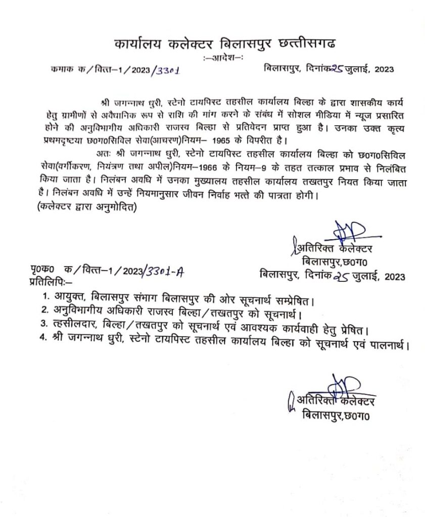 शिकायत होने और वीडियो सामने आने के बाद एडिशनल कलेक्टर ने स्टेनो टायपिस्ट जगन्नाथ धुरी को सस्पेंड कर दिया है। निलंबन अवधि में उसका मुख्यालय तखतपुर रहेगा और उसे जीवन निर्वाह भत्ता दिया जाएगा। इस अवैध वसूली के खेल में नायब तहसीलदार के मिलीभगत होने की बात कही जा रही है। बताया जा रहा है कि नायब तहसीलदार बिना पैसे के किसी भी फाइल में हस्ताक्षर नहीं करतीं।