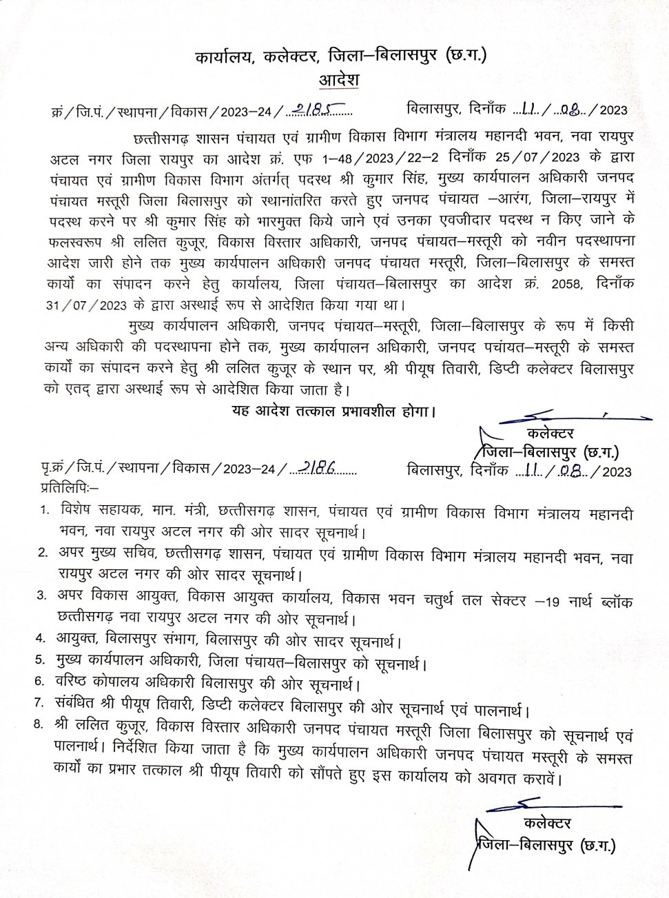 डिप्टी कलेक्टर पीयूष तिवारी को मिला मस्तूरी जनपद पंचायत के सीईओ का प्रभार…जिला कलेक्टर ने जारी किए आदेश
