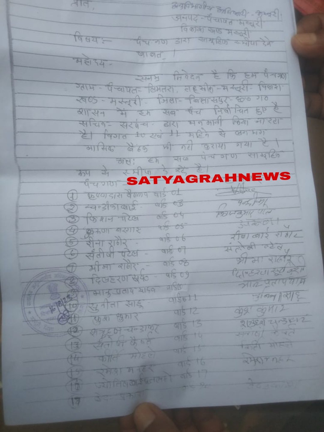 मस्तुरी – जनपद पंचायत मस्तूरी क्षेत्र के ग्राम पंचायत लिमतरा में सरपंच,सचिव से परेशान होकर 19 वार्डो के पंचों ने मस्तूरी स्थित एसडीएम कार्यालय पहुंचकर सामूहिक इस्तीफा देने एसडीएम कार्यालय में आवेदन दिया है जिससे हड़कंप मचा हुआ है। मिली जानकारी के अनुसार मस्तूरी जनपद पंचायत क्षेत्र के ग्राम लिमतरा के वार्डो से चुनकर जनप्रतिनिधि बने गांव के पूरे वार्ड पंचो ने एक साथ सामूहिक इस्तीफ़ा देने की जानकारी मिलते ही पूरे गांव में हड़कंप मचा हुआ है। दरअसल गांव के 19 पंचों ने लिमतरा पंचायत सरपंच एवं सचिव के ऊपर गंभीर आरोप लगाते हुए एक साथ पूरे गांव के पंचों ने सामूहिक इस्तीफ़ा देने का निर्णय लिया,