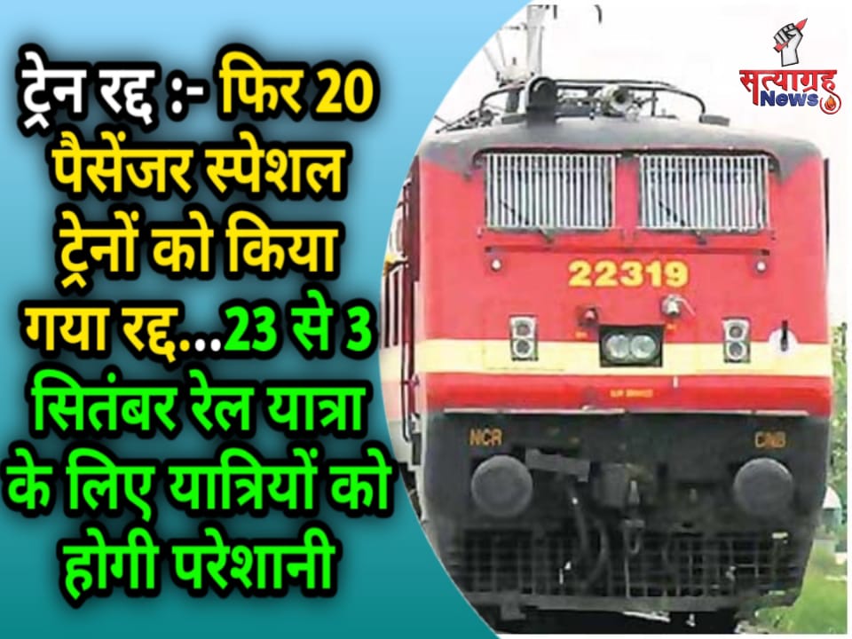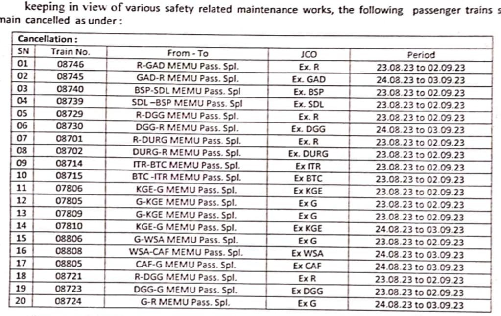 बिलासपुर – दक्षिण पूर्व मध्य रेलवे के विभिन्न सेक्शनों में गतिशीलता के उन्नयन और चल रहे विभिन्न सुरक्षा संबंधी रखरखाव कार्यों में सुधार एवं ट्रैक रखरखाव कार्य के लिए 20 पैसेंजर स्पेशल गाड़ियों को रद्द कर दिया गया है,