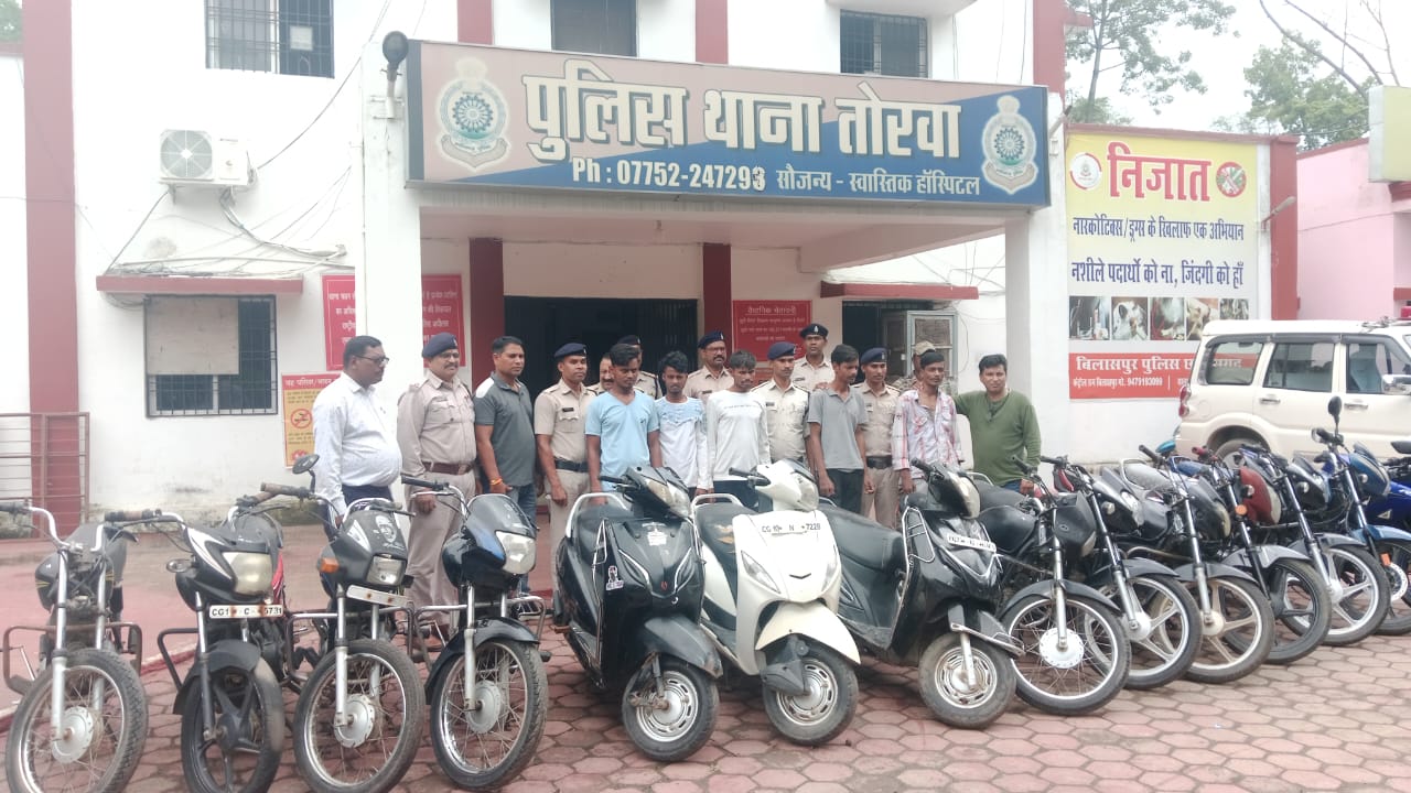 बिलासपुर – शहर के अलग अलग जगहों से घूम घूमकर बाइक चोरी करने वाले आरोपियों को तोरवा पुलिस ने गिरफ़्तार कर लिया है। तोरवा पुलिस ने एक दो नहीं बल्कि 6 चोरों को एक साथ गिरफ्तार किया है। जिनके कब्जे से एक दर्जन बाइक पुलिस ने बरामद की है। मामले का खुलासा करते हुए तोरवा पुलिस ने बताया कि बाइक चोरी के खिलाफ़ तोरवा पुलिस ने विशेष अभियान चलाया। इस दौरान उन्हें सूचना मिली कि शंकर नगर ओवर ब्रिज के नीचे नाबालिग द्वारा चोरी का मोटरसायकल रखने की जानकारी मिली। जहां दबीश देकर पुलिस ने आरोपी को गिरफ़्तार किया। जिसके बताए अनुसार पुलिस ने तोरवा पंप हाउस से दो नग बाइक बरामद किया है। वही पूछताछ के बाद क्षेत्र में बाइक चोरी करने वाले आरोपियों कि फेहरिस्त सामने आई। फिर क्या तोरवा पुलिस हेमूनगर निवासी राहुल ठाकुर,चुचुहियापारा निवासी मोहम्मद सलीम और निसार अली,तोरवा निवासी निखिल यादव और मुकुल यादव तक पहुंची। जिनके कब्जे से पुलिस ने 10 चोरी की बाइक बरामद की है। पुलिस ने 6 आरोपियों के कब्जे से मिले 12 बाइक को जब्त कर सभी आरोपियों को गिरफ़्तार कर न्यायिक हिरासत में भेज दिया है। उक्त कार्यवाही में थाना प्रभारी कमला पुसाम ठाकुर, सउनि भरतलाल राठौर, प्र.आर. साहेब अली, किशन लाल नवरंग आरक्षक कमलेश्वर शर्मा सुनील सिंह, अनूप किण्डो लक्ष्मी कश्यप म.आर.इफरानी का सराहनीय योगदान रहा।