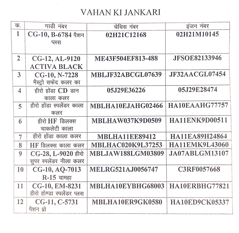 चोरी हुई बाइक में सीजी 10 बी 6784, सीजी 12 ए एल 9120, सीजी 10 एन 7228, काले रंग का हीरो होंडा सीडी डॉन , काले रंग का हीरो होंडा स्पलेंडर, हीरो डील्स, हीरो होंडा, एचएफ दिलक्स, सीजी 28 एल 9020 , सीजी 10 एक्यू 7013, सीजी 10 ईएम 8231, सीजी 11 सी 5731 शामिल है।
