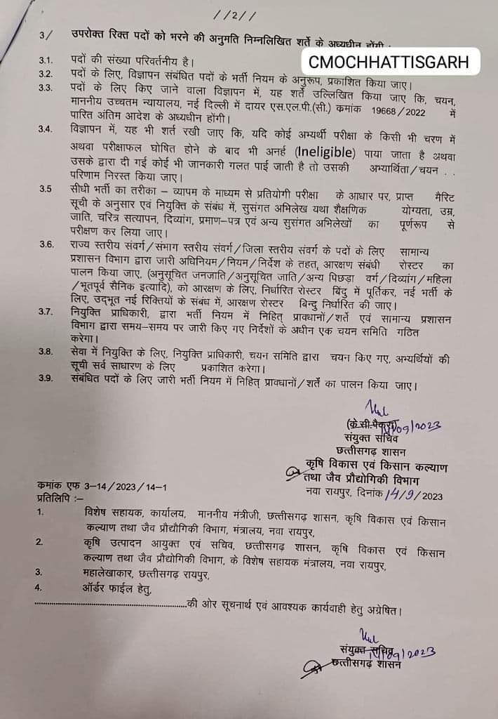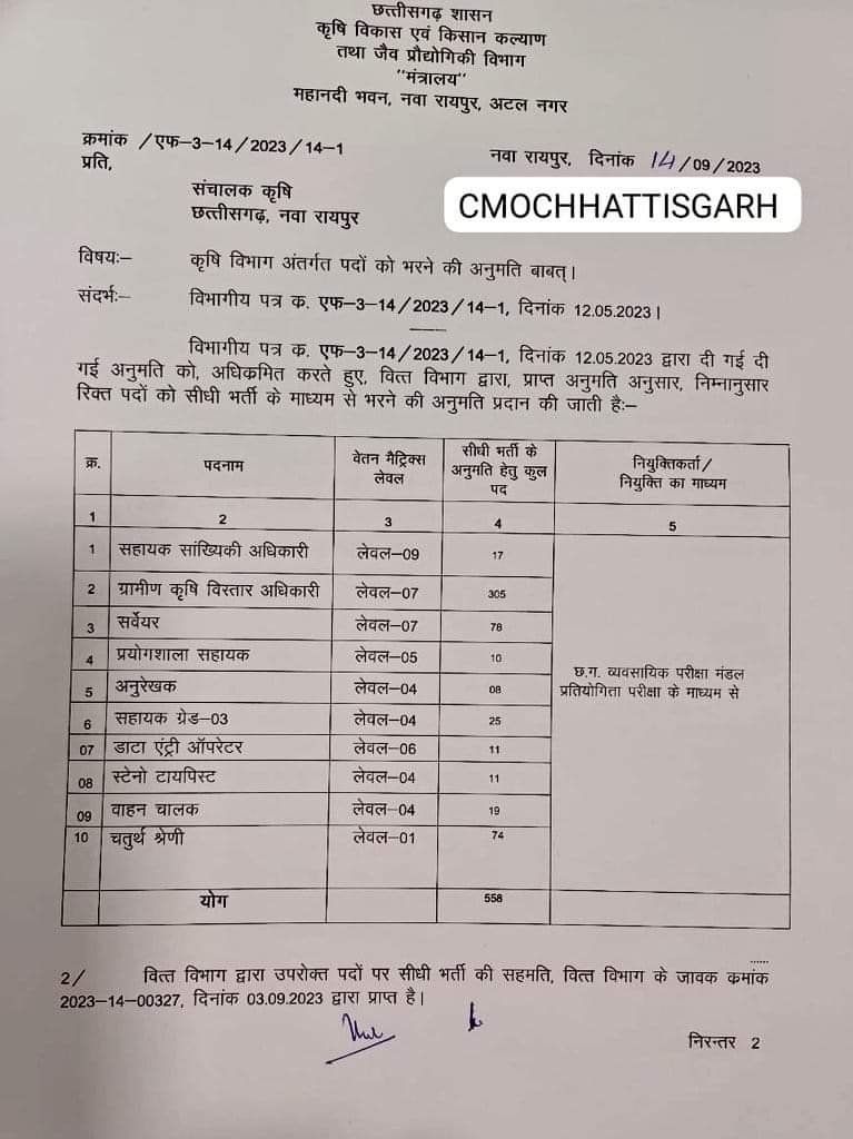 मुख्यमंत्री भूपेश बघेल के निर्देशानुसार कृषि विभाग में सहायक सांख्यिकी अधिकारी, ग्रामीण कृषि विकास अधिकारी, सर्वेयर, प्रयोगशाला सहायक, अनुरेखक, सहायक ग्रेड 3,डाटा एंट्री ऑपरेटर, स्टेनो, वाहन चालक और चतुर्थ श्रेणी के पदों पर भर्ती होगी।