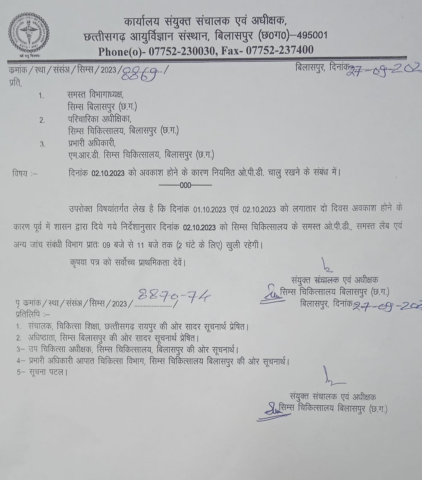 ऐसे में दो दिनों तक शासकीय अवकाश से उनको होने वाली समस्या को देखते हुए सिम्स प्रबंधन ने सभी विभाग प्रमुखों को सोमवार 2 अक्टूबर को ओपीडी चालू करने निर्देश दिया है। जारी निर्देश में यह साफ किया गया है कि सिम्स चिकित्सालय के समस्त ओ.पी.डी., समस्त लैब एवं अन्य जांच संबंधी विभाग दो अक्टूबर को 09 बजे से 11 बजे तक (2 घंटे के लिए) खुली रहेगी।