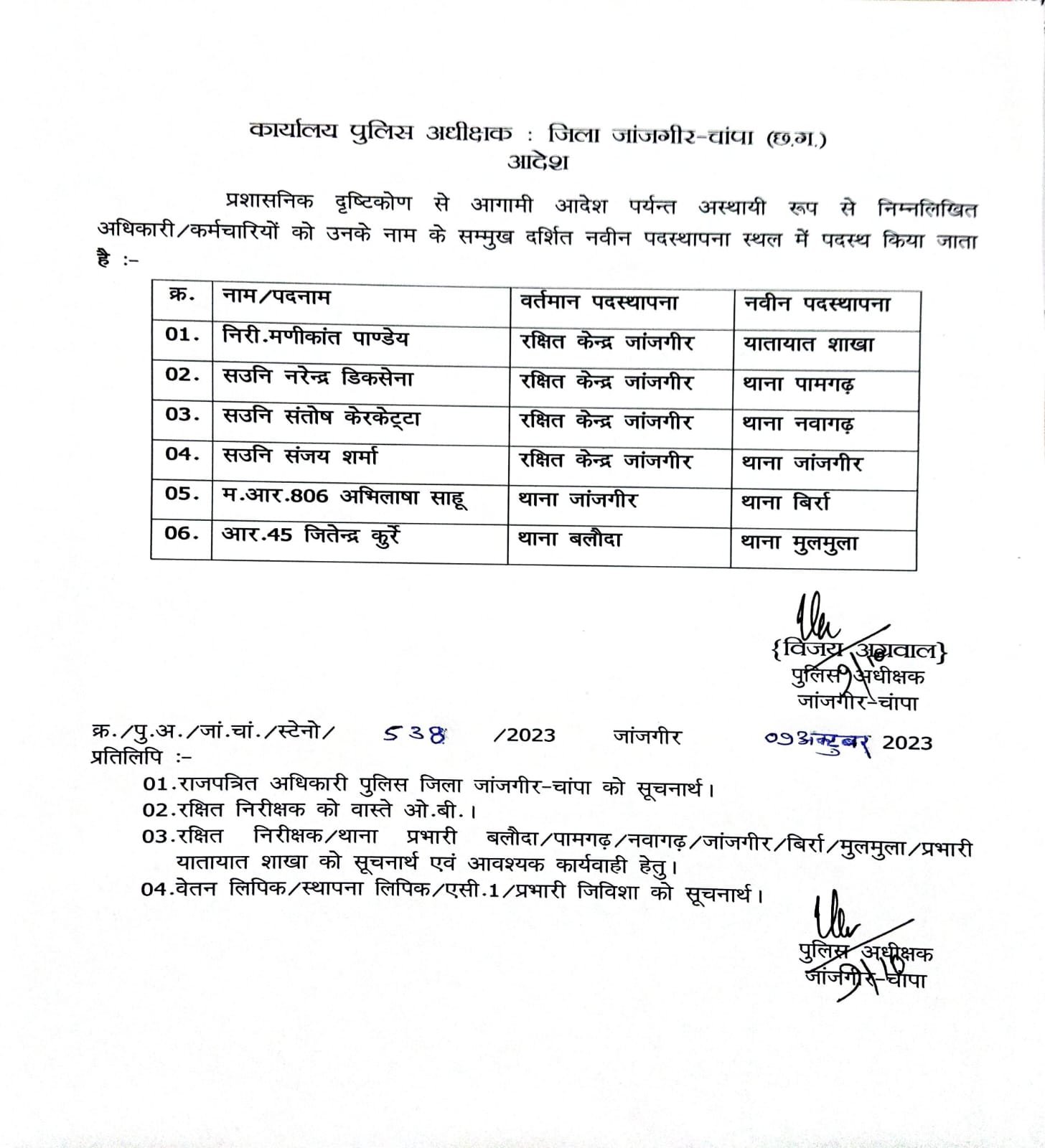 जांजगीर चाम्पा – जिले के पुलिस अधीक्षक ने पुलिस लाइन और थानों में पदस्थ कर्मचारियों का दबादला आदेश जारी किया है, 6 कर्मचारियों के नाम शामिल है देखिए लिस्ट…