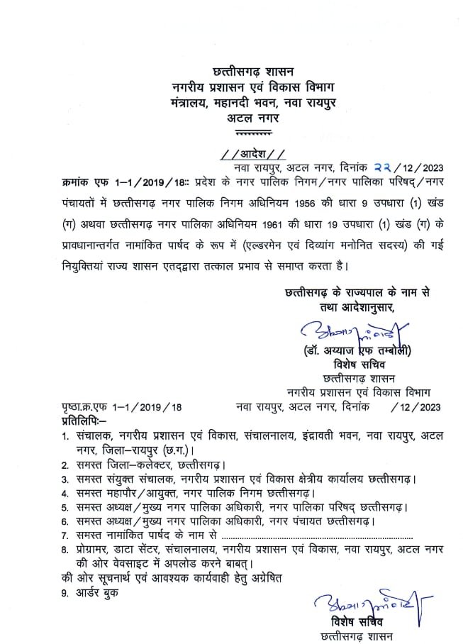 वही अब निगम, मंडलों में नियुक्त मनोनीत पार्षदों की नियुक्ति भी समाप्त कर दी गई है, जिसके लेकर नगरीय प्रशासन एवं विकास विभाग ने आदेश जारी कर दिया है।