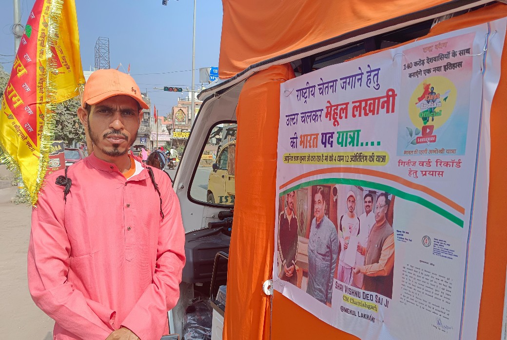 मेहुल का कहना है कि वे उल्टे चल कर समाज में चेतना का प्रयास कर रहें है और राष्ट्रीय चेतना जगाने के लिए ये पद यात्रा शुरू की गई है। उन्होंने छत्तीसगढ़ सरकार की रामलला दर्शन योजना की सराहना करते हुए कहा कि इससे श्री राम के प्रति आस्था रखने वाले सामान्य परिवार के लोग भी श्री राम मंदिर का दर्शन कर पुण्य लाभ कमा पाएंगे। मेहुल ने बताया कि वे स्वयं पैदल चलने के साथ अपनी मां को चार धाम और 12 ज्योतिर्लिंग की यात्रा ई-रिक्शा के जरिए करवा रहें है। मेहुल की यह अनूठी यात्रा बिलासपुर में लोगो के आकर्षण का केन्द्र बनी रही।