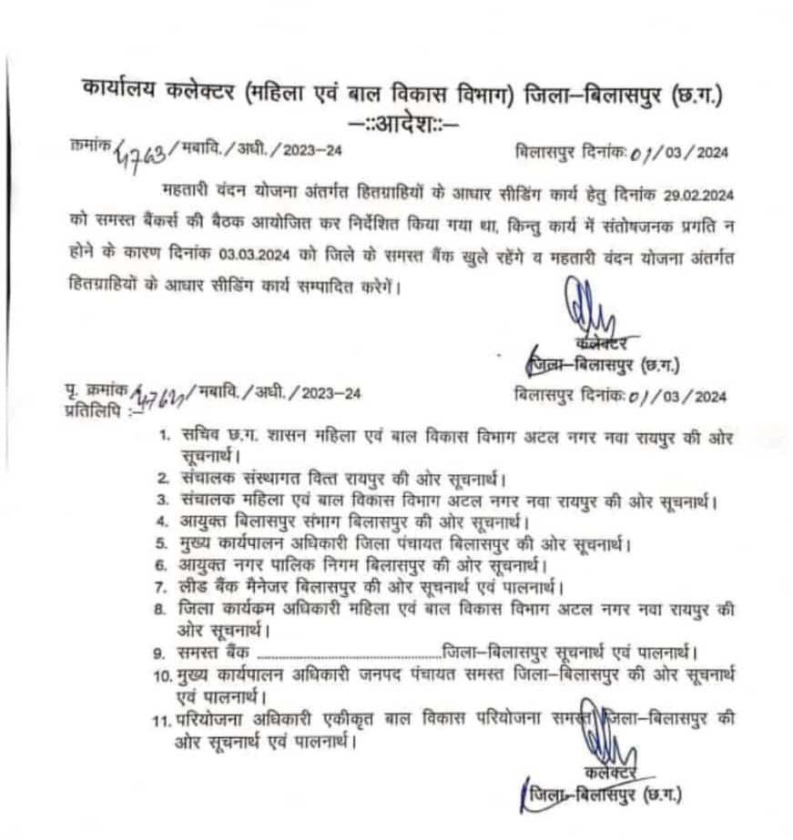 बिलासपुर – रविवार 3 मार्च को अवकाश के दिन भी जिले के सभी बैंक खुले रहेंगे। महतारी वंदन योजना के अंतर्गत आधार सीडिंग का कार्य इस दिन होगा। कलेक्टर एवं जिला दंडाधिकारी अवनीश शरण ने बैंक खोले जाने के आदेश जारी किए हैं। गौरतलब है कि बैंक खाते में आधार लिंक होने पर ही हितग्राहियों को योजना का रकम ट्रांसफर हो सकेगा। बड़ी संख्या में महिलाओं ने अभी तक आधार लिंक नहीं कराए हैं। उनकी सुविधा के लिए जिला प्रशासन ने अवकाश के दिन भी बैंक खोलवाएं है।
