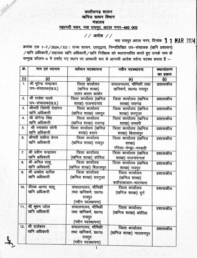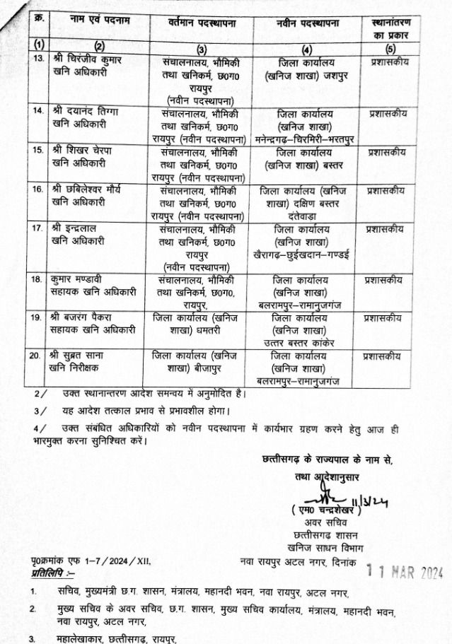 ट्रांसफर ब्रेकिंग :- अब खनिज विभाग में निकली ट्रांसफर लिस्ट….बड़ी संख्या में खनिज अधिकारियों को किया गया इधर से उधर