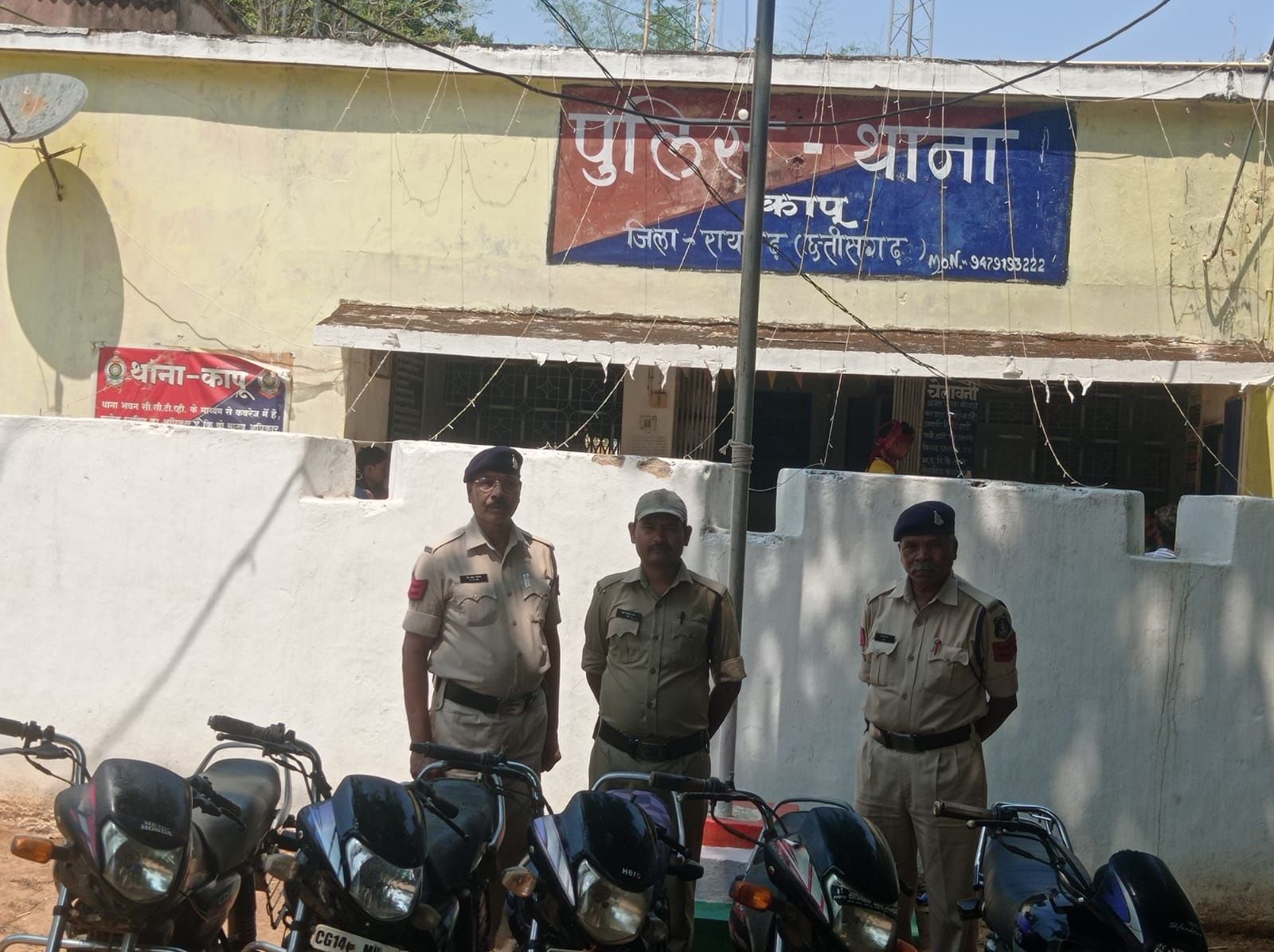 आरोपी संजय उर्फ कलाऊ नगेसिया पिता मंगलू नगेसिया उम्र 27 साल निवासी रतनपुर टिहलीसराई थाना कापू जिला रायगढ़ के कब्जे से 05 मोटर सायकल हीरो होण्डा सीडी डीलक्स काला रंग सोल्ड, हीरो एचएफ डीलक्स काला रंग सोल्ड, हीरो एचएफ डीलक्स रेड ब्लैक सोल्ड, हीरो एचएफ डीलक्स लाल काला रंग सोल्ड, हीरो स्प्लेंडर प्लस नीला काला रंग सोल्ड, कुल कीमती करीब 1,80,000 रुपए को बरामद किया गया । आरोपी ने बताया कि कल ही उसने चोरी की बाइक बिक्री के लिये निकाला और पकड़ा गया । थाना प्रभारी द्वारा आरोपी के पूर्व आपराधिक रिकार्ड की जानकारी निकाली गई जिस पर आरोपी संजय उर्फ कलाऊ नगेसिया के विरुद्ध पूर्व में थाना बतौली जिला सरगुजा में धारा 25, 27 आर्म्स एक्ट का अपराध दर्ज होने की जानकारी मिली है । आरोपी के कृत्य पर थाना कापू में धारा 41(1+4)CrPC/379 IPC के तहत कार्रवाई कर आरोपी को न्यायिक रिमांड पर जेल दाखिल किया गया है । पुलिस अधीक्षक दिव्यांग कुमार पटेल के दिशा निर्देशन एवं एडिशनल एसपी आकाश मरकाम व एसडीओपी धरमजयगढ़ सिद्धांत तिवारी के मार्गदर्शन में कार्यवाही में थाना प्रभारी कापू निरीक्षक नारायण सिंह मरकाम, प्रधान आरक्षक देवलाल राठिया, आरक्षक सामवेल मिंज और विभूति सिंह की महत्वपूर्ण भूमिका रही है ।