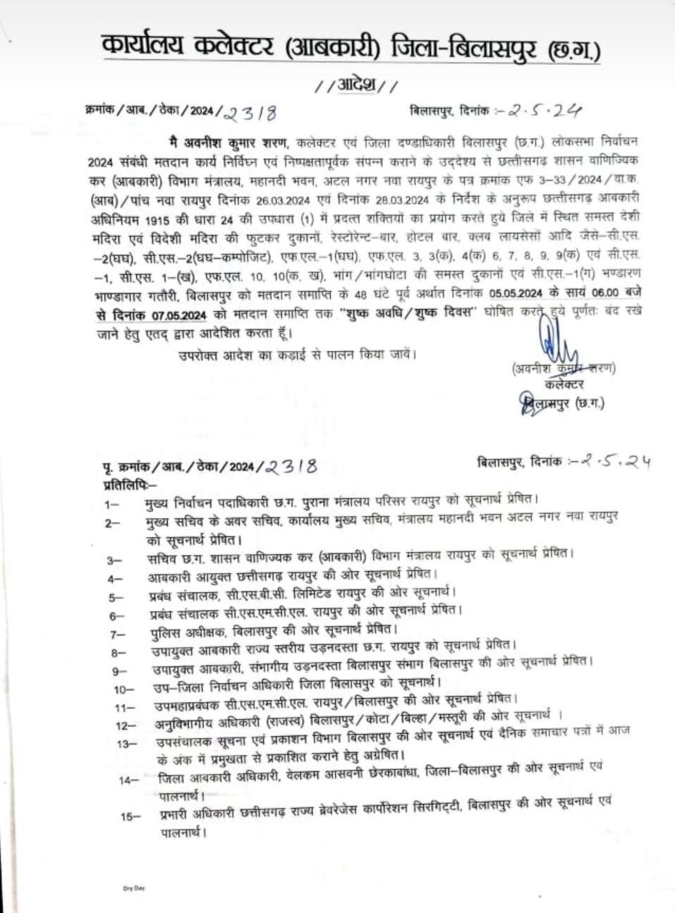 जिले में स्थित समस्त देशी मदिरा एवं विदेश मदिरा फुटकर दुकानों, रेस्टोरेण्ट, बार, क्लब आदि की समस्त दुकानों, भण्डारण, भण्डार गृह गतौरी बिलासपुर को मतदान समाप्ति के 48 घंटे के पूर्व अर्थात 05.05. 2024 की शाम 6 बजे से 07.05.2024 को मतदान समाप्ति तक शुष्क अवधि/शुष्क दिवस घोषित किया है एवं समस्त मदिरा दुकानों को उक्त अवधि में पूर्णतः बंद रखे जाने का आदेश दिया है। उपरोक्त आदेश का पालन कड़ाई से किये जाने के निर्देश कलेक्टर द्वारा पुलिस विभाग एवं आबकारी विभाग को दिये गये है।