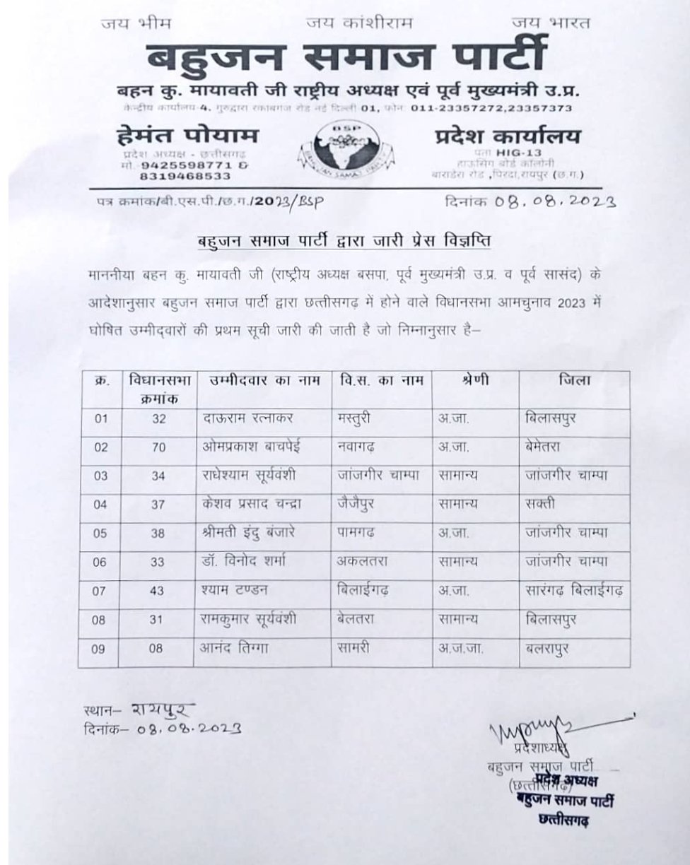 रायपुर – बहुजन समाज पार्टी ने आगामी विधानसभा चुनाव को लेकर अपने प्रत्याशियों की पहली लिस्ट जारी कर दी है, जिसमें 9 उम्मीदवारों के नाम शामिल है, देखिए लिस्ट