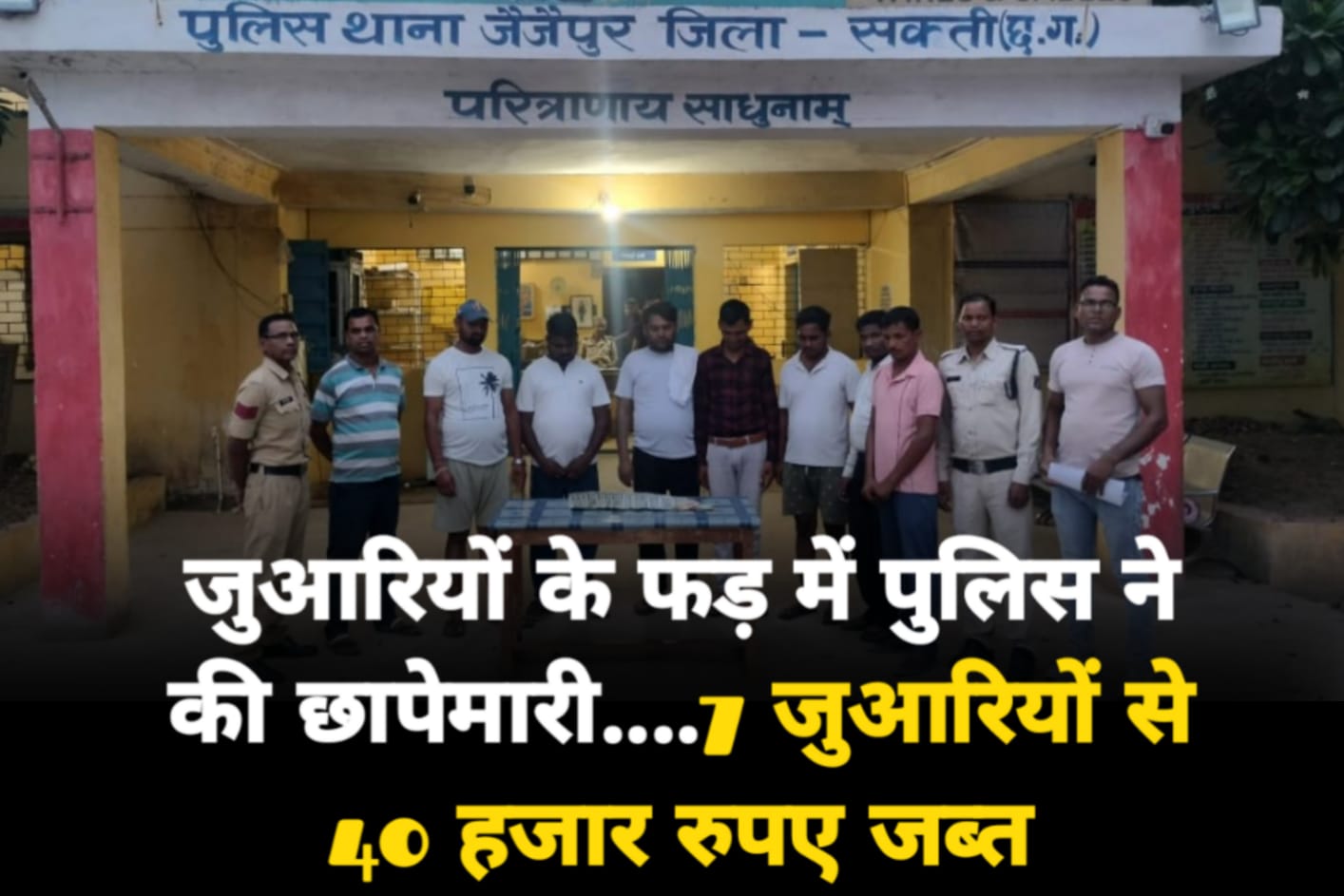 सक्ती – पुलिस अधीक्षक के निर्देश पर शनिवार को जैजैपुर पुलिस ने हजारों रुपए के चल रहे जुए की महफिल में दबिश देकर सात जुआरी को गिरफ्तार किया है। जिसके कब्जे से 40 हजार 200 रुपए पुलिस ने बरामद किए हैं। मिली जानकारी के अनुसार जैजैपुर थाना क्षेत्र अंतर्गत ग्राम कचंदा में स्थानीय पुलिस को सूचना मिली कि गांव में जुए की महफिल सजी हुई है जिस पर स्थानीय पुलिस ने मौके पर छापा मारा। जहां पुलिस को देख कुछ जुआरी भागने लगे, लेकिन स्थानीय पुलिस की सूझबूझ से वह अपने मंसूबों पर कामयाब नहीं हो सके। जहां मौके पर जैजैपुर निवासी अनुज कुमार चंद्रा,नंदकुमार चंद्रा,कचंदा निवासी बुधराम सिदार,करौवाडीह निवासी लक्ष्मीनारायण चंद्रा ,देव कुमार कोशले और विक्रम सिंह टंडन को पुलिस ने रंगे हाथों पकड़ा आपको बता दे की महज चंद लोगों के द्वारा लगाई गई इस महफिल में 40 हजार रुपए से भी अधिक रुपए पर हार जीत का दांव लगाया जा रहा था। स्थानीय पुलिस ने सातों आरोपियों के कब्जे से 40 हजार 200 रुपए सहित ताश के पत्ते बरामद किया है। मामले में पुलिस ने सभी आरोपियों के खिलाफ जुआ एक्ट के तहत कार्यवाही की है। उक्त कार्यवाही में थाना प्रभारी निरीक्षक ललित चंद्रा के मार्गदर्शन में स.उप.नि. मिश्रा, प्र. आर. श्रीकांत सेंगर, आरक्षक शत्रुघ्न जांगड़े, दिनेश पटेल, मनोज खतरजी, संतोष मानिकपुरी, घनश्याम पांडेय, , किशोर सिदार का सराहनीय योगदान रहा।