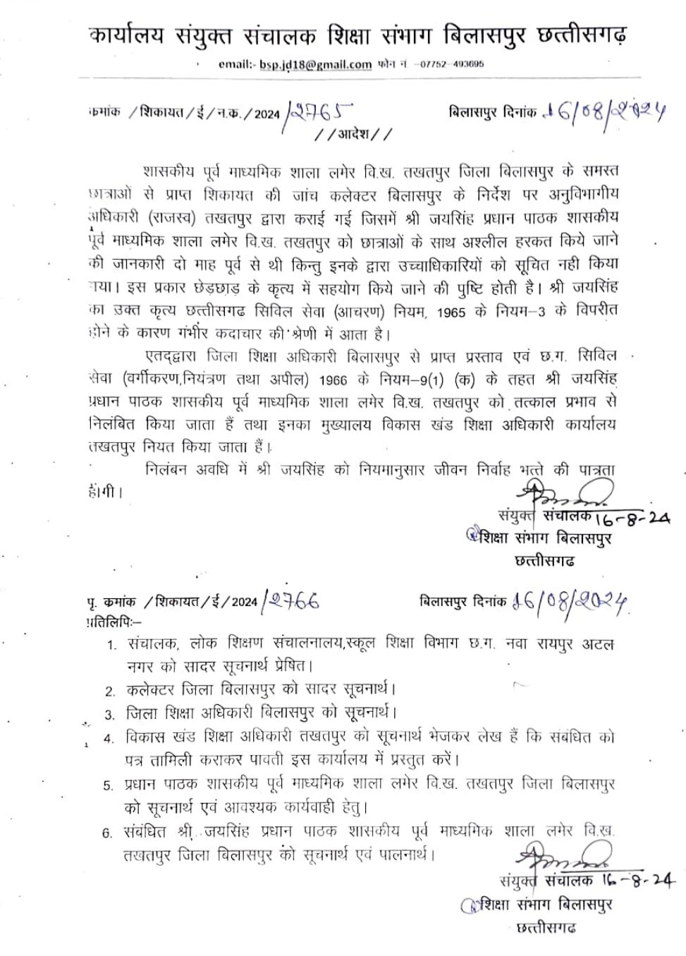 बिलासपुर – शासकीय पूर्व माध्यमिक शाला लमेर विकासखंड तखतपुर की छात्राओं ने कलेक्टर अवनीश शरण से शिकायत की थी कि विद्यालय में शिक्षक राम नारायण दुबे उनसे छेड़छाड़ करता है, कलेक्टर अवनीश शरण ने इसे गंभीरता से लिया और एसडीएम तखतपुर से इसकी जांच कराई गई, जांच में पाया गया कि रामनारायण दुबे शिक्षक के द्वारा इस प्रकार की घटना की गई है।