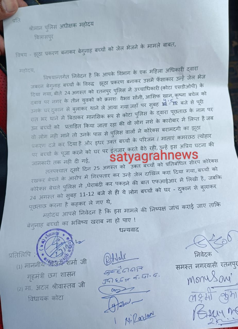 रतनपुर – बीते दिनों रतनपुर थाना में नगर के नाबालिग सहित तीन बच्चो पर कोटा एसडीओपी के दबाव के चलते झूठा प्रकरण दर्ज करने की शिकायत पीड़ित परिवार सहित नगरवासियों ने पुलिस अधीक्षक से कर न्याय करने की गुहार लगाई है,24 अगस्त को रतनपुर थाना मे एक नाबालिग सहित तीन बच्चो पर भारतीय न्याय संहिता की धारा 21,22 के तहत प्रकरण दर्ज कर उन्हें जेल भेज दिया गया था,जिसमे पुलिस ने बताया कि उक्त तीनों युवक रात साढ़े दस बजे के करीब महामाया हेलीपेड की ओर प्रतिबंधित सीरप की बिक्री घुम घुमकर कर रहे थे, आसिफ,वैभव,कौशल नामक युवक से प्रतिबंधित सिरप कोरेक्स सोलह शीशी बरामद करना बताया है,