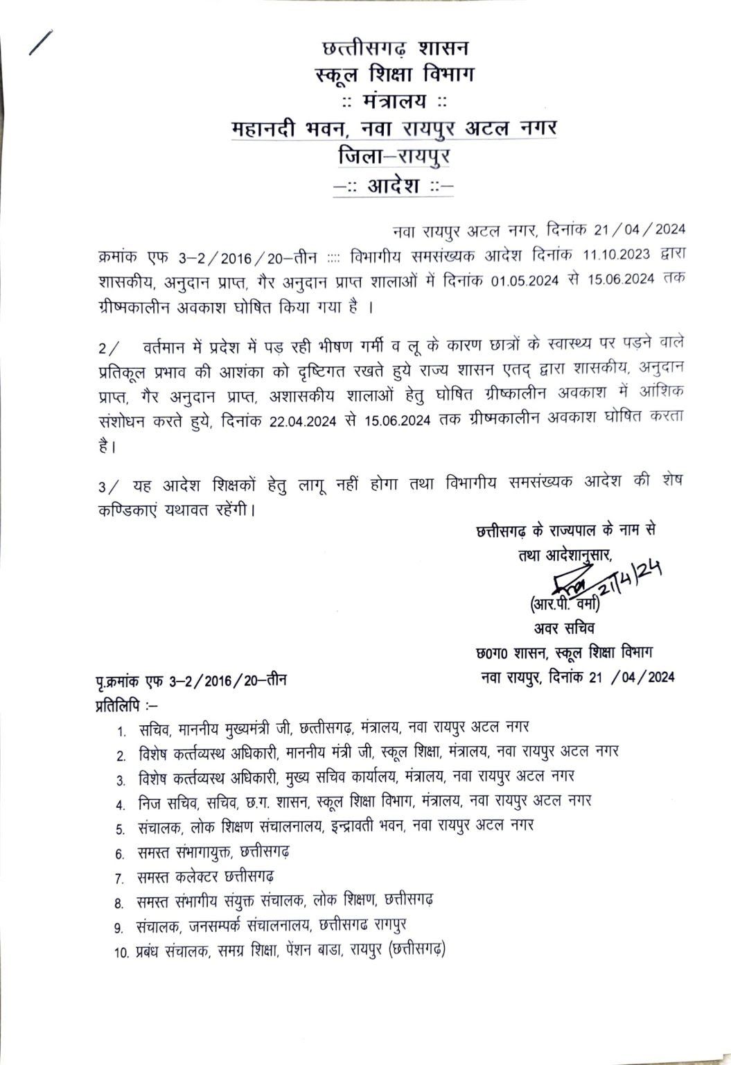 जिसे वर्तमान में प्रदेश में पड़ रही भीषण गर्मी व लू के कारण छात्रों के स्वास्थ्य पर पड़ने वाले प्रतिकूल प्रभाव की आशंका को दृष्टिगत रखते हुये राज्य शासन एतद् द्वारा शासकीय अनुदान प्राप्त , गैर अनुदान प्राप्त अशासकीय शालाओं हेतु घोषित ग्रीष्कालीन अवकाश में आंशिक संशोधन करते हुये 22.04.2024 से 15.06.2024 तक ग्रीष्मकालीन अवकाश घोषित करता हैं। यह आदेश शिक्षकों हेतु लागू नहीं होगा तथा विभागीय समसंख्यक आदेश की शेष कण्डिकाएं यथावत रहेंगी ।