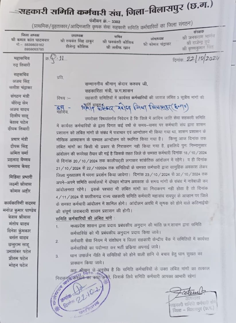 साथ ही धान खरीदी वर्ष 2023-24 में धान परिदान पश्चात हुई संपूर्ण सुखद मान्य किया जाए और जिला सहकारी बैंक में समिति के 50 प्रतिशत कर्मचारियों को भर्ती किया जाए। उन्होंने साफ कहा है कि यदि सरकार मांगें पूरी कर देती है तो ठीक है नहीं तो उन्हें मजबूर होकर 4 नवंबर से अनिश्चितकालीन हड़ताल पर जाना पड़ेगा,