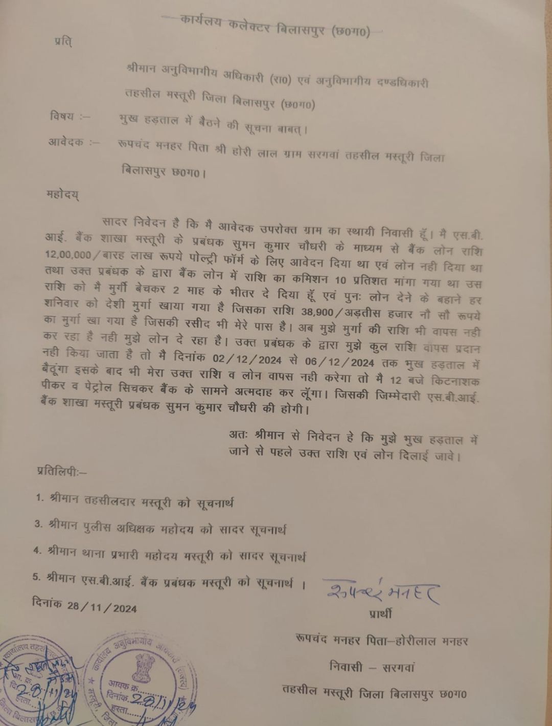 बिलासपुर – जिले के मस्तूरी ब्लॉक मुख्यालय में स्थित एसबीआई के ब्रांच मैनेजर पर एक ग्रामीण ने गंभीर आरोप लगाए है और उसने न्याय नही मिलने पर पहले तो भूख हड़ताल और फिर आत्मदाह की चेतावनी दी है। जिसने अपने विरोध प्रदर्शन के लिए प्रशासन से आवेदन देकर बकायदा अनुमति भी मांगी है। दरअसल ग्रामीण रूपचंद मनहर पिता होरीलाल ग्राम सरगंवा (मस्तूरी)निवासी ने जिला कलेक्टर के नाम एसडीएम मस्तूरी को ज्ञापन सौंपा है कि उसने पोल्ट्री फार्म के व्यवसाय के लिए एसबीआई बैंक मस्तूरी में 12 लाख रुपए लोन के लिए आवेदन किया था,